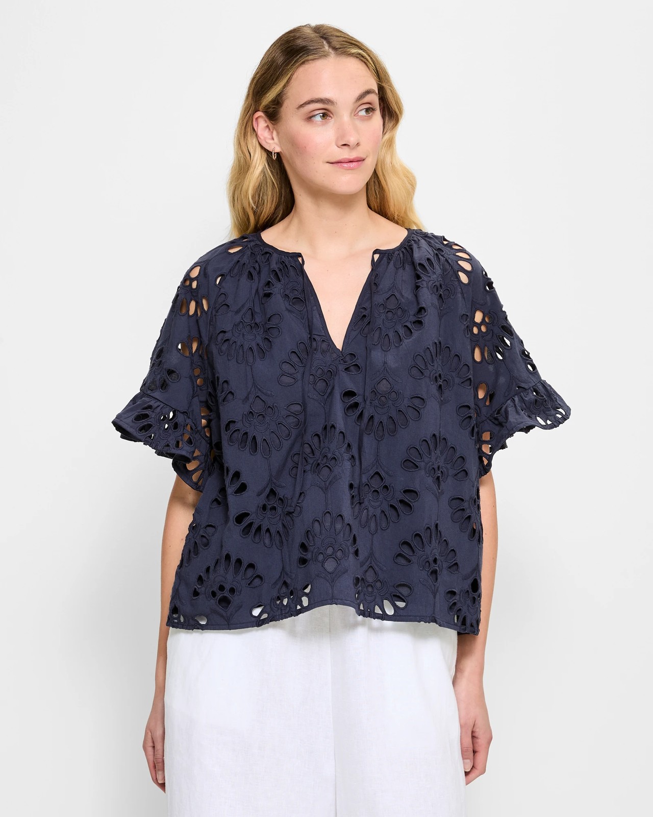 Discover the charm of our Cutout Detail Top, designed from soft cotton for a comfortable wear. Ideal for both daily outings and special events, this top features a unique cut-out pattern that brings a touch of sophistication to your look. The round neckline with a stylish v-drop front and a lovely tie-up detail is sure to impress. With short flutter sleeves adorned with frills and a straight hemline for a timeless finish, this piece is a wardrobe essential. Make every day fashionable with this delightful addition.