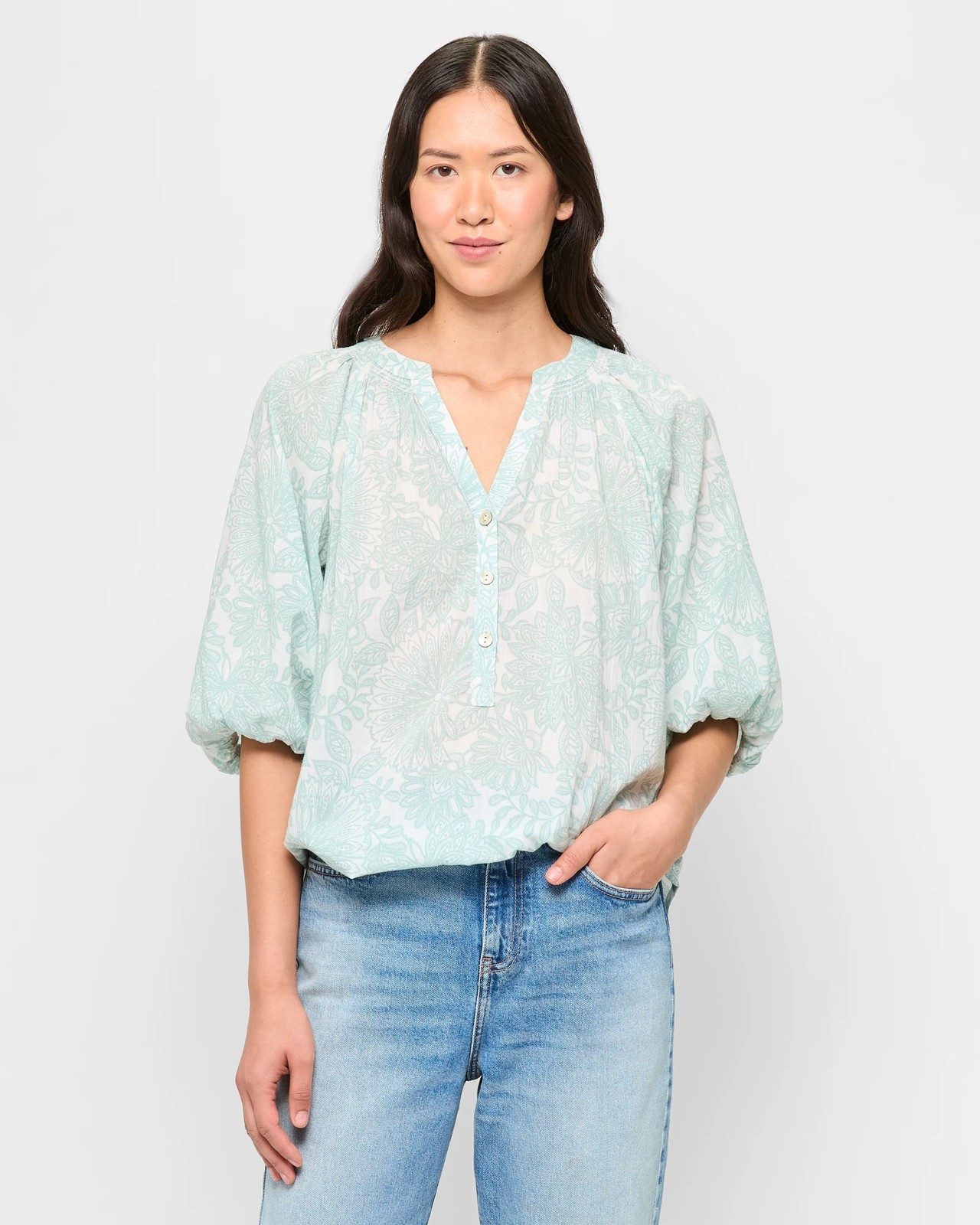 Enhance your wardrobe with the Dallas Puff Sleeve Blouse. Made from soft, breathable cotton, this blouse keeps you comfortable while looking stylish. The regular fit shapes perfectly, accentuated by the round neckline and a charming v-drop at the front. The shirred gathering around the neck and charming puff sleeves with elastic cuffs lend a touch of sophistication. Ideal for casual outings or more formal occasions, this blouse is a versatile addition to any wardrobe. Make it yours today and transform your style.