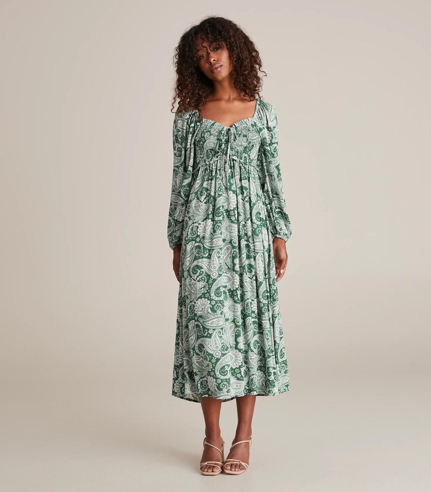 Great for everyday wear and can easily be dressed up or down, the Dannii Minogue Petites shirred midi dress has a shirred chest, long sleeves and a midi length for coverage.