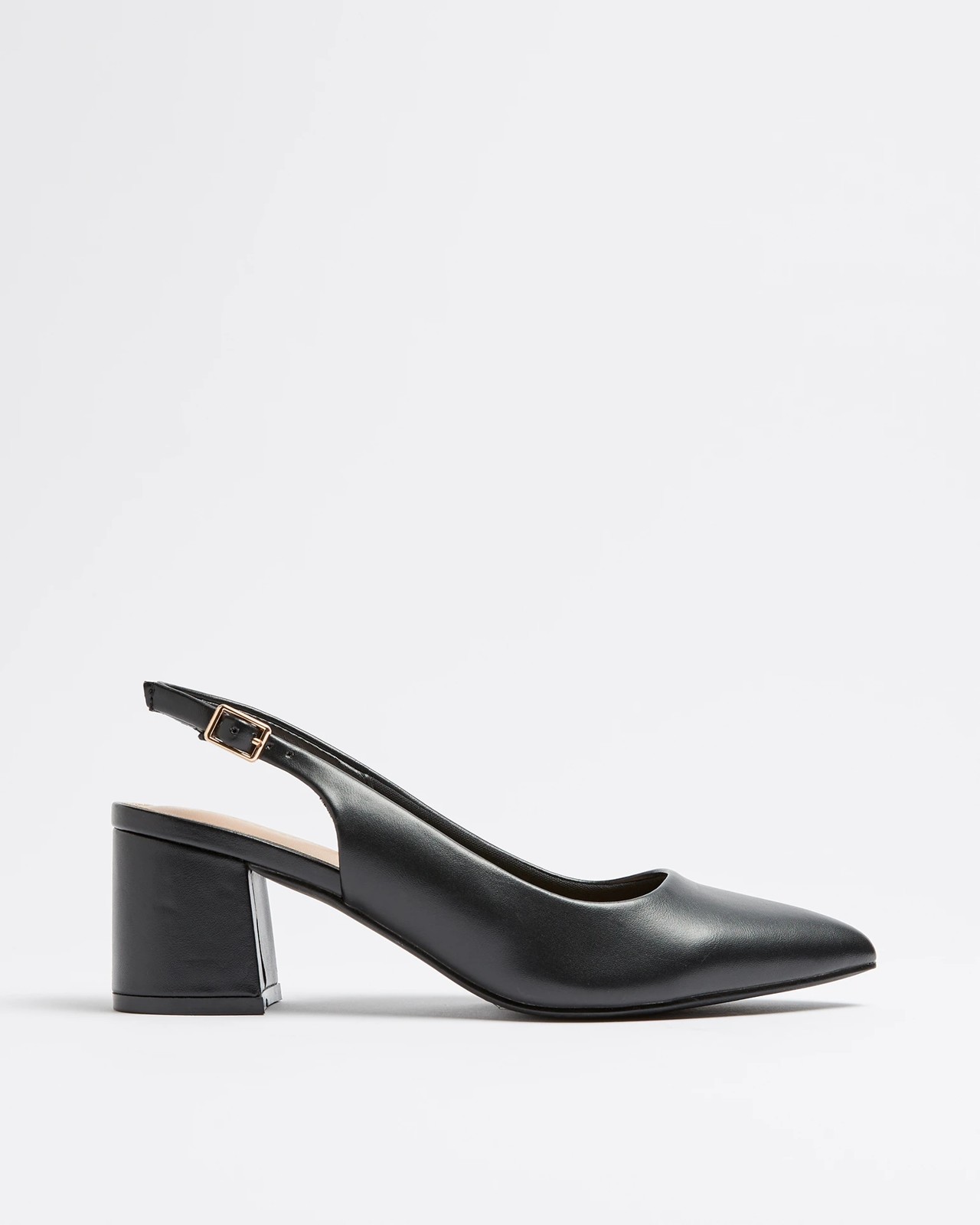 Take your look to the next level with our Darla V Sling Back Block Heel. Crafted from a combination of synthetic materials, these chic heels feature a leather-look design. With a pointed closed toe, open top and an adjustable sling back strap with buckle side closure, you'll feel both secure and stylish. The cushioned inner sole provides comfort for all day wear, while the non-slip sole and block heeled bottom complete the look.