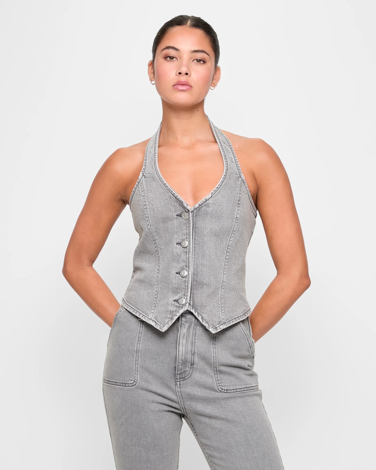 Experience the allure of our Denim Halter Waistcoat from Lily Loves. Made with a cotton-rich fabric infused with elastane, this waistcoat combines comfort and fashion. The grey wash and tailored fit provide a sleek, contemporary appearance, while the halter neckline and V-front enhance its stylish appeal. Great for pairing with your favourite tops, the button-through front and pointed hemline offer a distinctive design. Perfect for those who love to stay ahead in fashion, this waistcoat is an essential piece for your wardrobe. Get yours now and redefine your style.
