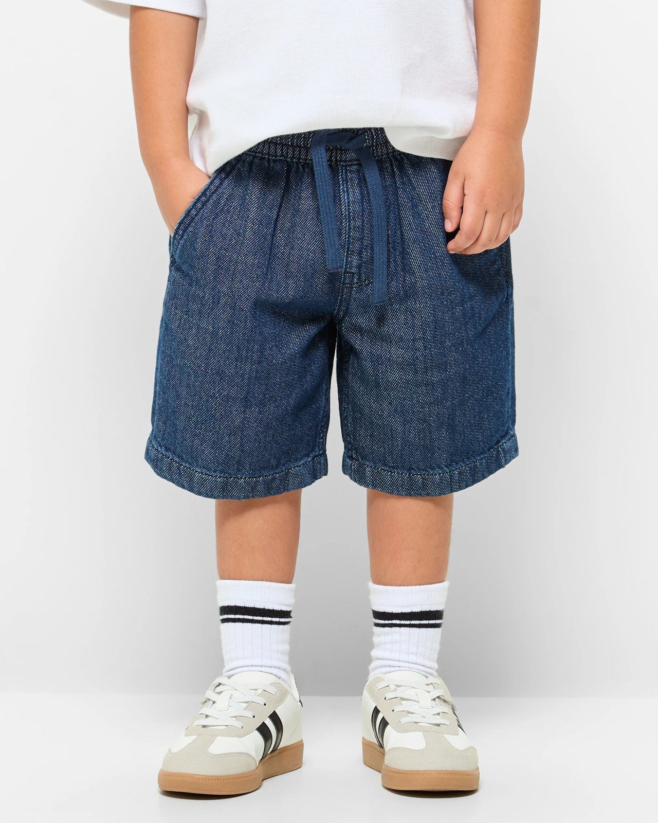 Discover comfort and style with our Denim Pull On Volley Shorts for boys. These shorts feature an easy pull-on design, complete with a convenient elastic waistband and drawcord for the perfect fit. The practical side and back pockets make them ideal for everyday adventures. Whether it's for a casual outing or a day of play, these shorts are set to be a wardrobe favourite. Give your child the gift of comfort and fashion now.