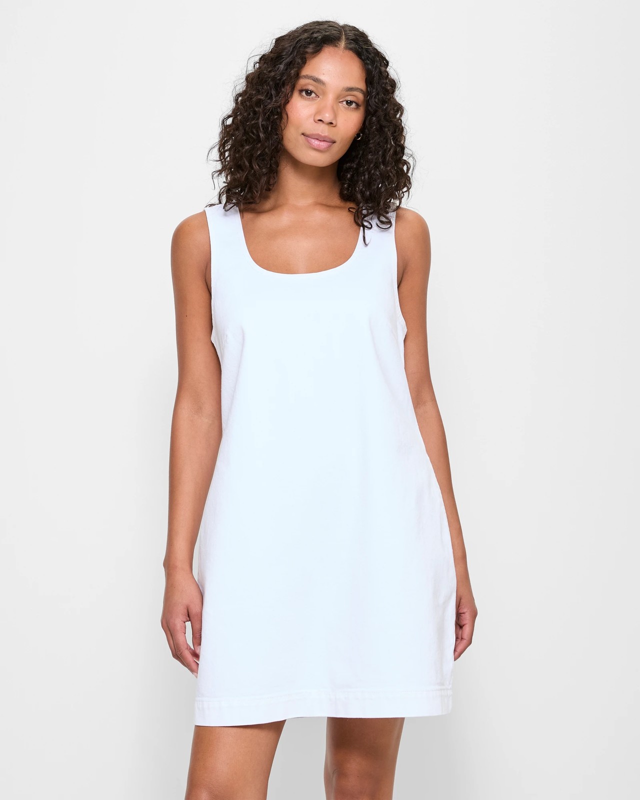 Discover the charm of our Denim Scoop Neck Shift Dress. Designed with a blend of cotton and elastane, it offers both comfort and a great fit. Featuring a scoop neckline and sleeveless cut, this dress is ideal for any season. The chest darting ensures a refined fit, and the mini length with a straight hemline gives a modern touch. Add this versatile piece to your wardrobe and enjoy its timeless appeal.