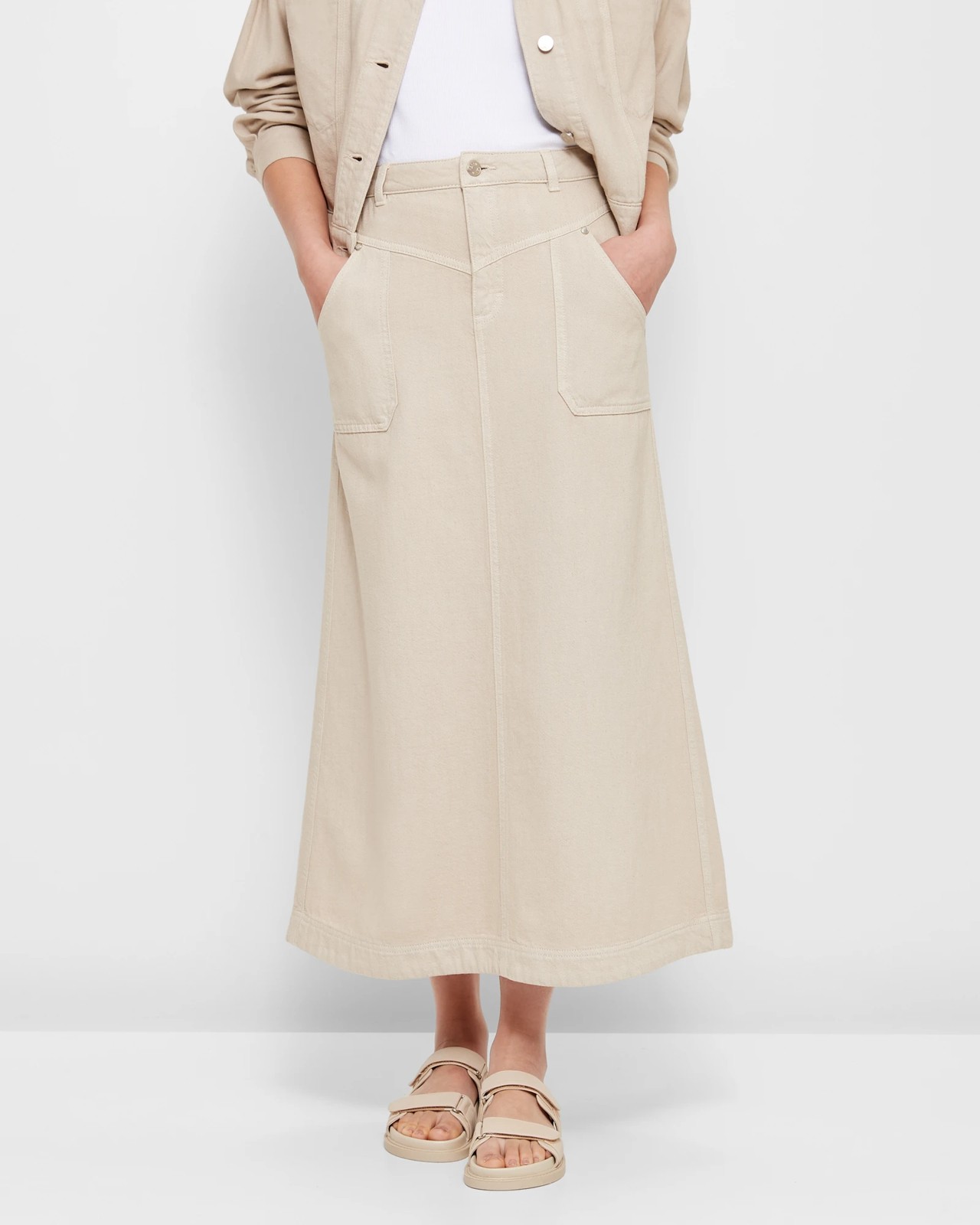 Introducing the Denim Utility Detail Maxi Skirt, a must-have addition to your wardrobe. Crafted with care from premium cotton fabric, including recycled cotton, this skirt combines sustainability with undeniable style. Offering a regular fit and a structured waistband with belt loops, it provides a comfortable and flattering silhouette for any body shape. The front button and zip closure ensure easy on and off, while the yoke panel adds a touch of uniqueness to the design.Featuring front utility pockets, this skirt not only looks great but also offers practicality. Store your essentials on the go, without compromising on style. With its maxi length and straight cut, it exudes elegance and sophistication, making it perfect for various occasions. The straight hemline adds a touch of simplicity, while the open back pockets and back center split enhance the overall design. Whether you're heading to the office, a casual outing, or a special event, this Denim Utility Detail Maxi Skirt is a statement piece that will elevate your outfit. Don't miss out on this trendy and sustainable skirt. Order yours now and experience the perfect blend of fashion, comfort, and environmental responsibility.