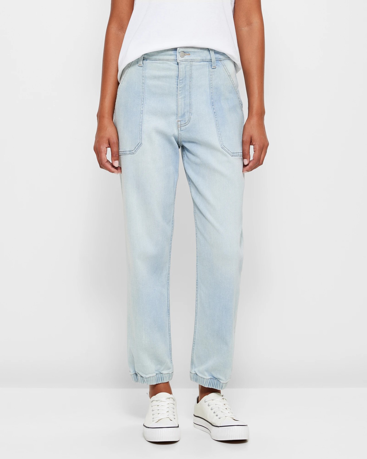 Introducing our Denim Utility Jogger Pants, a versatile and comfortable addition to your wardrobe. These jogger pants are made from a high-quality cotton/polyester blend that not only provides stretch for ultimate comfort but also contains recycled materials, making them an eco-friendly choice. The regular fit offers a relaxed yet stylish look, while the back pleather patch with embossed DENIM wording adds a touch of sophistication. The structured waistband with belt loops ensures a perfect fit, and the front button and fly closure, along with the DENIM embossed button, offer convenience and style. The large front utility pockets provide ample space for your essentials, while the classic jogger cut and tapered leg add a trendy touch. The elastic cuffs not only give a snug fit but also add a sporty vibe. Complete with back pockets for extra storage, these Denim Utility Jogger Pants are both practical and fashion-forward. Experience ultimate comfort and style with these versatile jogger pants. Upgrade your wardrobe today!