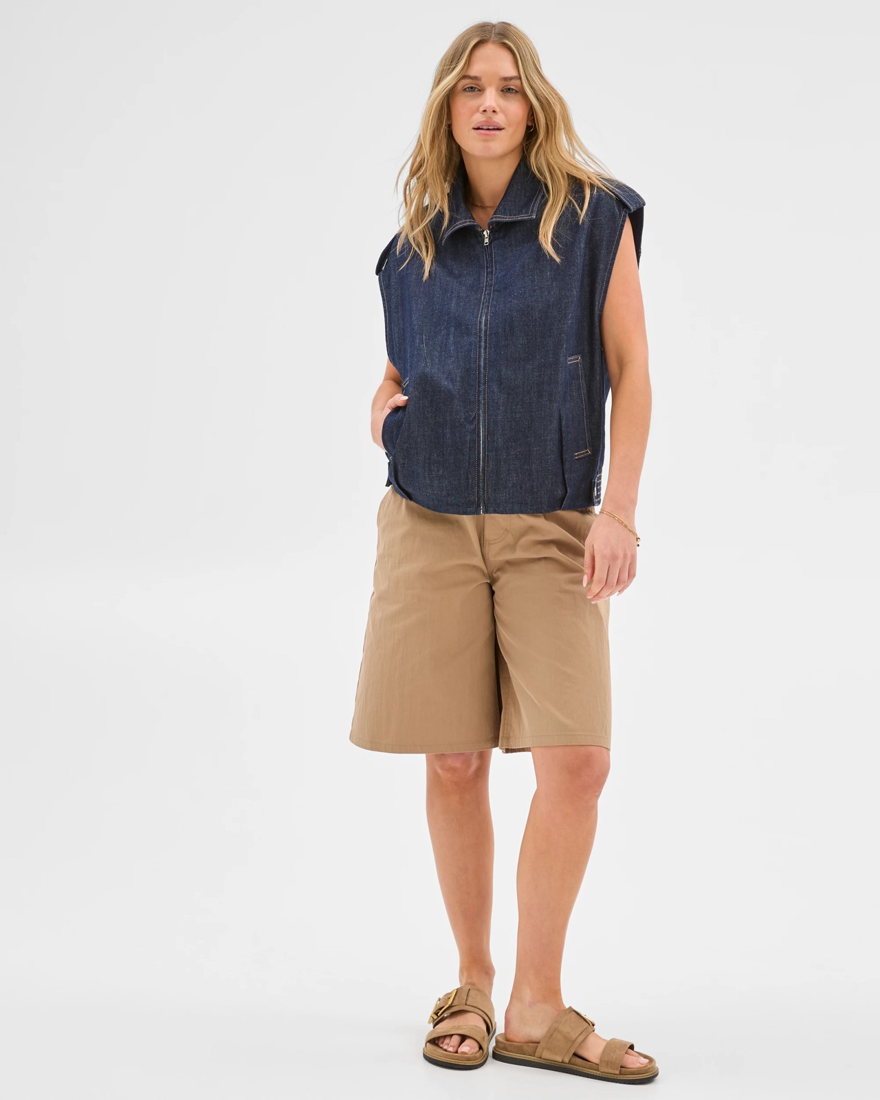 Step confidently into your day with the Denim Utility Vest by Lily Loves. This lightweight, easy-to-wear vest instantly elevates your favourite basics, whether you’re meeting friends or heading out for a stroll. Its dark indigo blue hue and modern round collar add a dash of stylish flair, while practical details like side pockets and a handy zip front mean you’ll always have what you need close by. The comfy straight hem and sleeveless design are perfect for layering throughout all seasons. Add this vest to your wardrobe and enjoy effortless style in every moment.