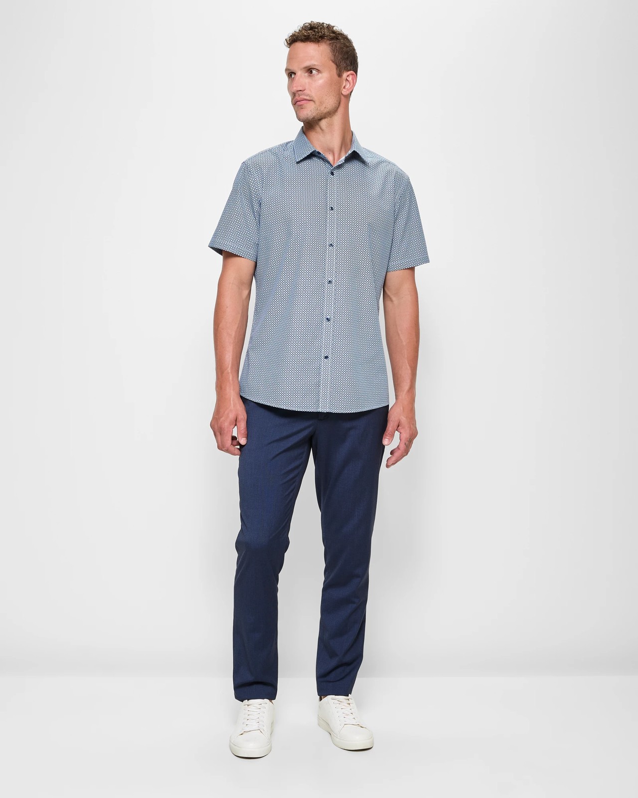Discover the perfect blend of style and comfort with our Diamond Geo Print Shirt. Using top-quality cotton, this shirt ensures you stay cool and comfortable throughout the day. The eye-catching diamond geometric pattern adds a distinctive touch to your ensemble. Designed with a regular fit, it features a round collared neckline and a convenient button-through front. The short sleeves and curved hemline provide a relaxed yet polished look. This blue shirt is an essential addition to your wardrobe – don't miss out!
