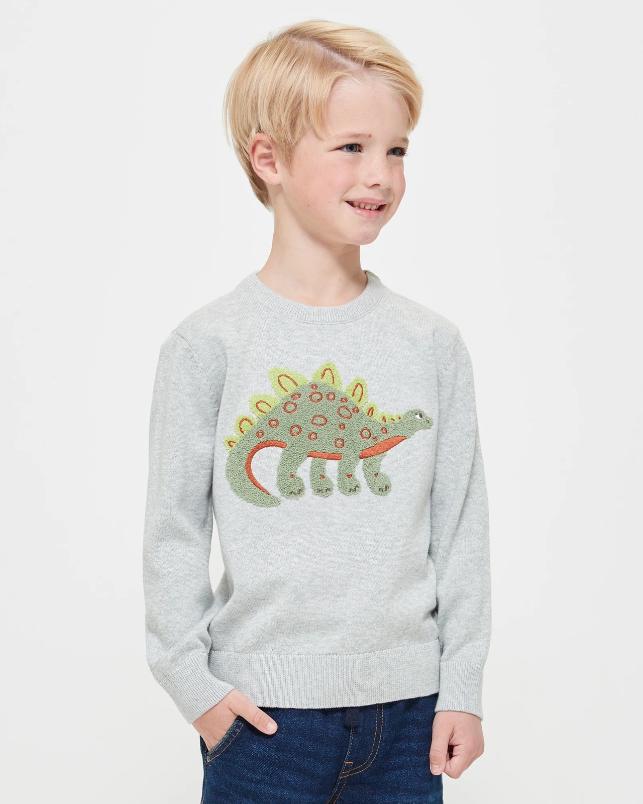 Wrap your little one in warmth and charm with our Dinosaur Boucle Knitting Jumper. Crafted from soft cotton knit, its regular fit and crew neck design ensure comfort and style are perfectly paired. The playful boucle dinosaur applique on the front adds a fun touch that will surely bring smiles. From cool autumn adventures to cosy winter snuggles, give your child a wardrobe staple that stands out.