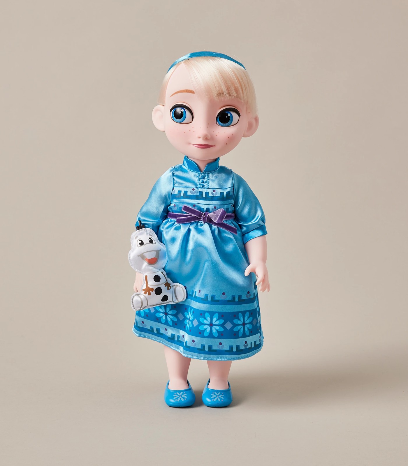 Elsa, the Frozen sister with icy powers, is re-imagined as a bright-eyed little girl. Inspired by character designer Bill Schwab's sketches, this newly refreshed doll in satin dress is accompanied by sun-loving snowman Olaf.