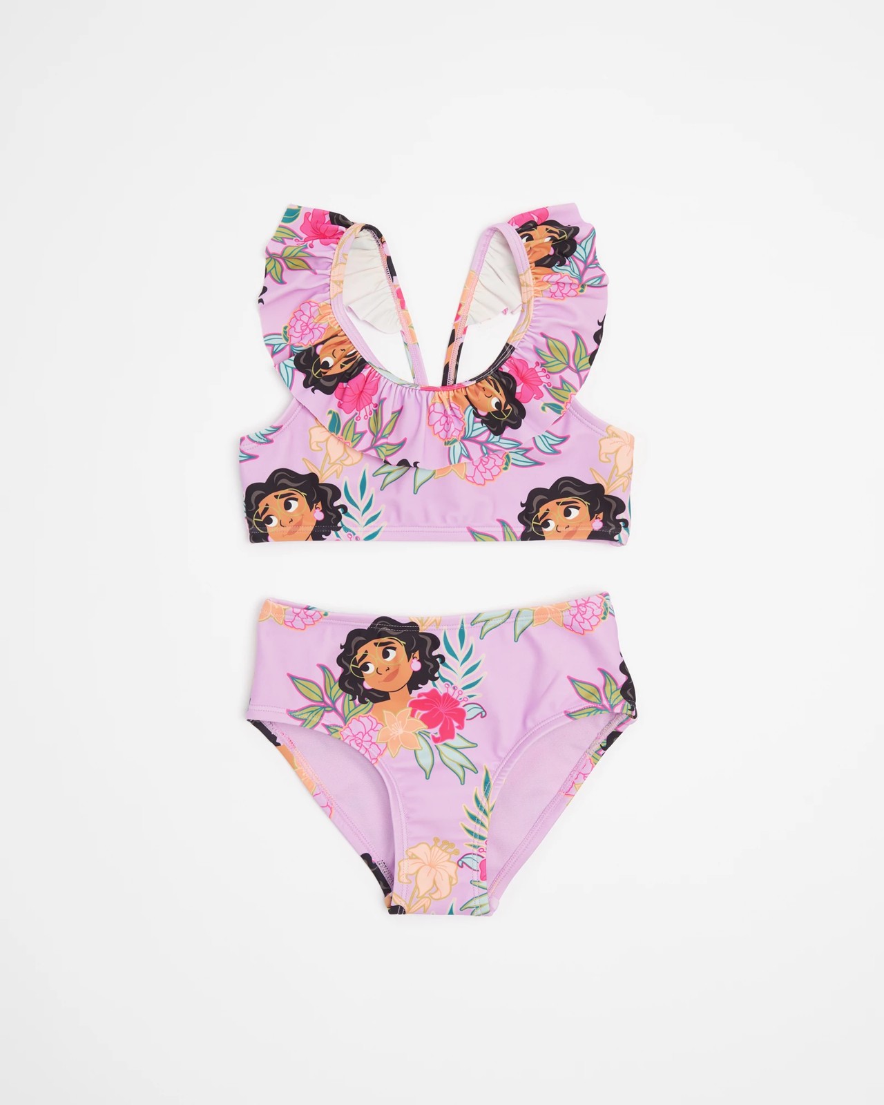 This 2 Piece Disney Encanto Swim Bikini Set has been crafted using recycled materials and features a regular fit. The set includes a purple all-over Disney Encanto print, a round neck with frill trim, matching briefs, and is fully lined for comfort. Perfect for any beach day or pool visit!