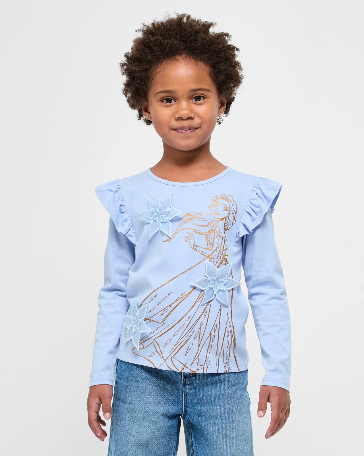 Transform your little one’s wardrobe with this delightful Disney Frozen long sleeve top, made from soft Australian cotton. Perfect for everyday adventures, it features a comfortable fit with a charming crew neck and whimsical shoulder frills. Elsa, sparkling in metallic print and adorned with floral appliqué, brings a touch of magic to the front. Dress your child in this lovely blue top and make every day feel like a fairy tale. Embrace the charm and add it to her collection today.