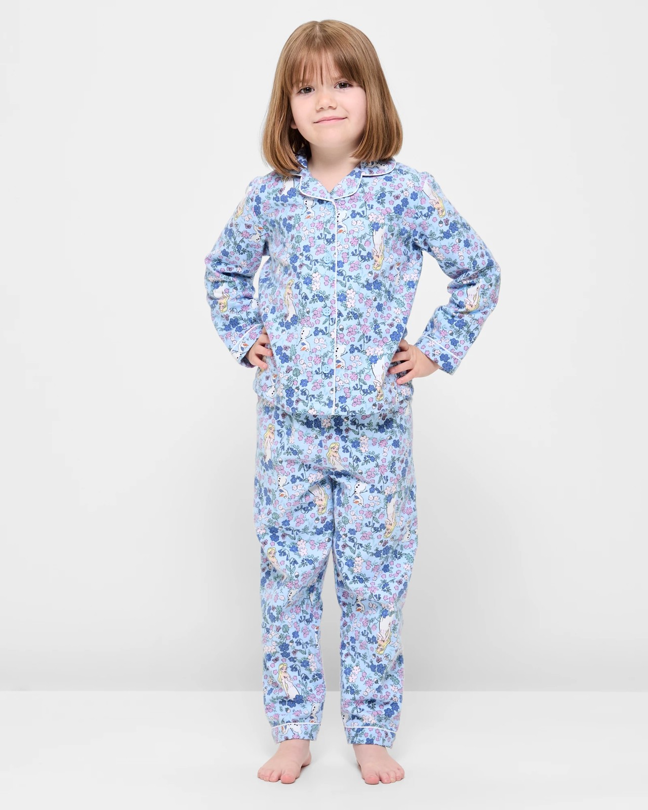 Treat your little one to cosy nights with this delightful Disney Frozen pyjama set. Made from soft cotton flannelette, it offers a regular fit that ensures comfort while sleeping. With its charming blue Frozen print, featuring all their favourite characters, bedtime has never been so exciting. The set includes a button-up collared top with long sleeves and stylish piping around the collar, cuffs, and down the front, paired with matching pants featuring an elastic waistband and piped, cuffed ankles. Perfect for keeping warm and snug during chilly nights, this set makes bedtime magical. Grab this adorable sleep set and make every bedtime feel like a fairy tale.