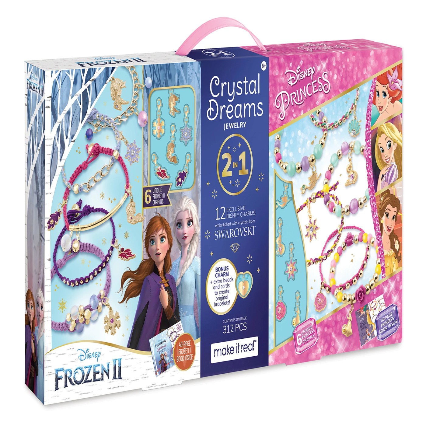 Disney Princess includes 6 x Disney Princess charms with Swarovski crystal, 5 x colours of cord, elastic cord, 117 x gold beads, 2 x rose shaped beads, 4 x translucent beads, 36 x colored beads, book and instructions