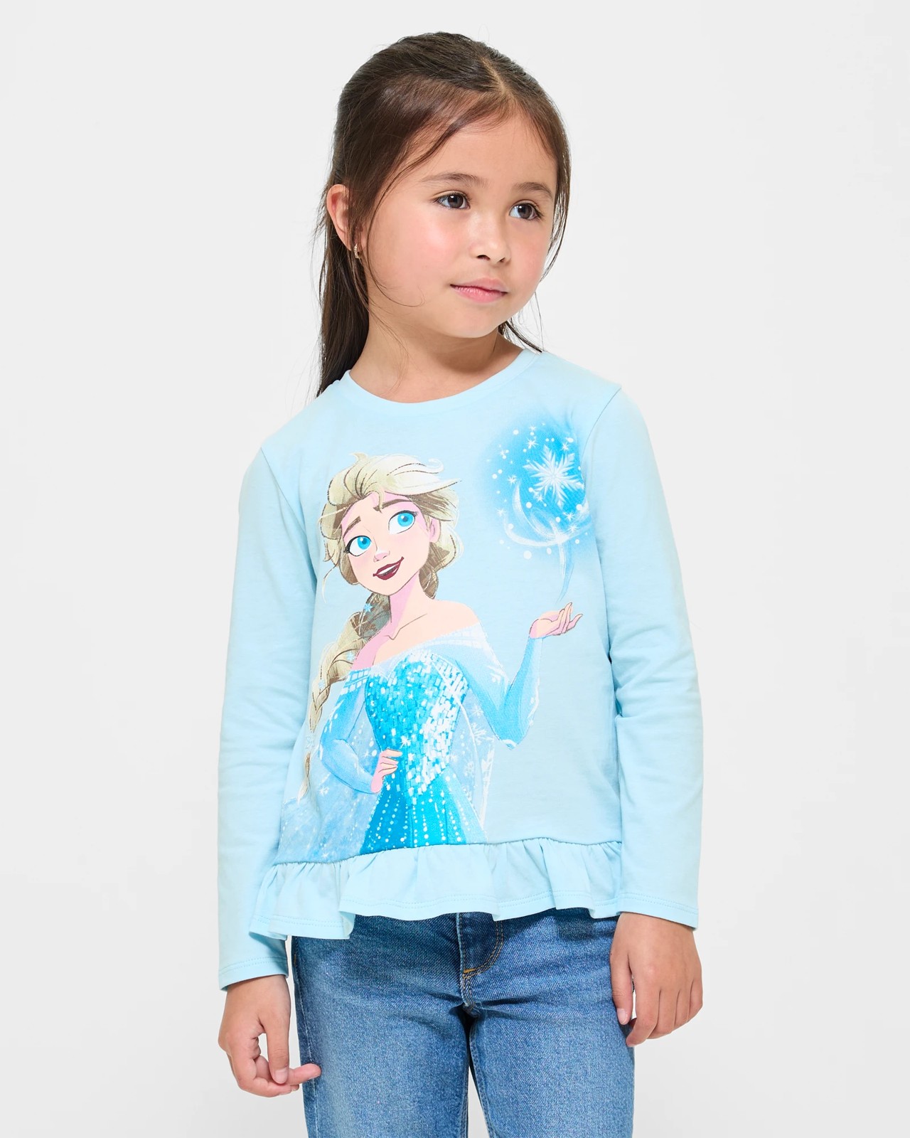 Step into enchanting winter wonderlands with the Disney Frozen Long Sleeve Top. Embrace magical moments with the large Disney Frozen Elsa print on the front, set against a stunning light blue background. Crafted from soft cotton, the top features long sleeves and a charming frill hemline. Its regular fit provides all-day comfort while creating a magical look for any aspiring princess. Transform everyday wear into a fairy tale adventure and add a touch of Frozen magic to your little one's wardrobe today!
