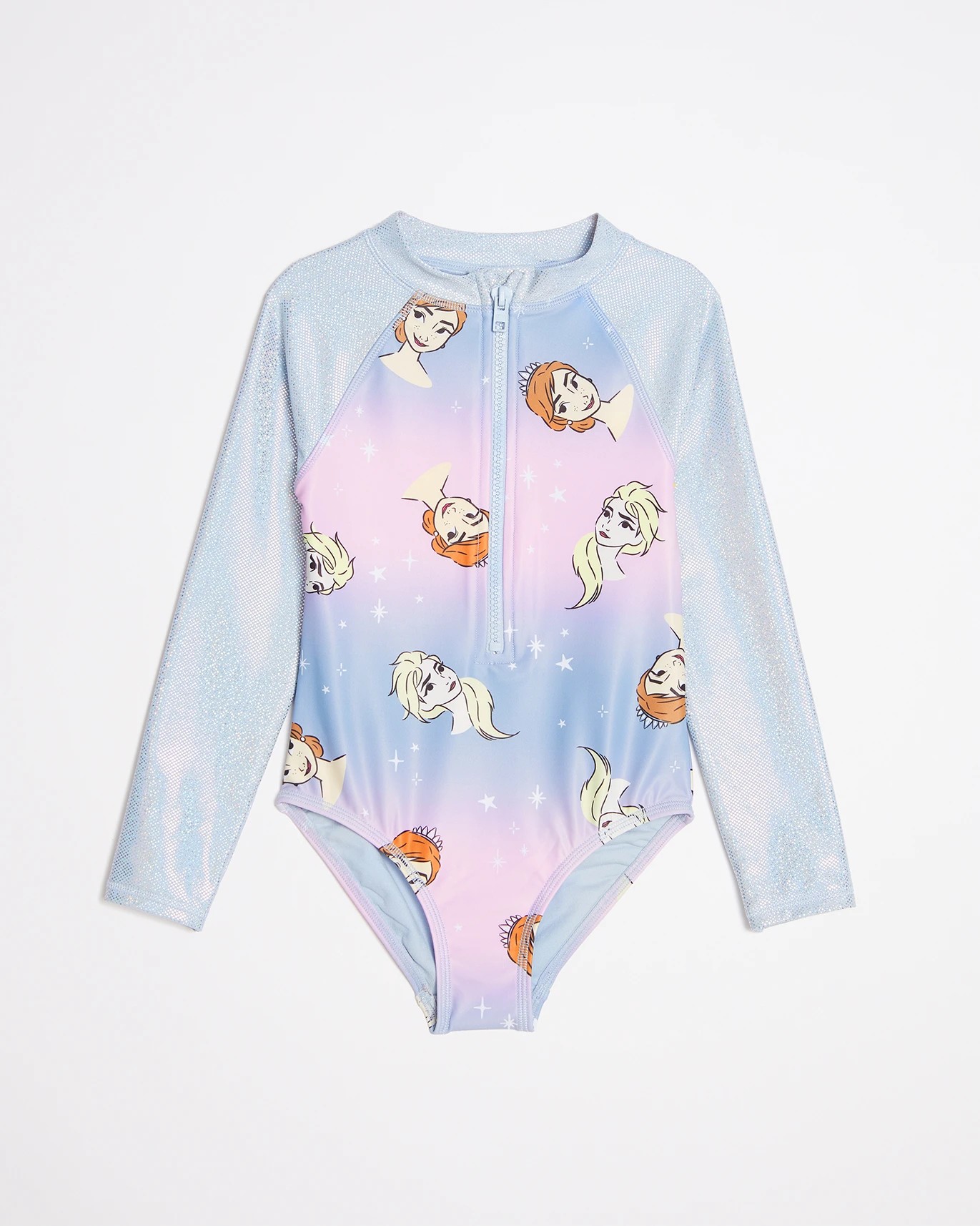 Let your little one make a splash with this awesome Disney Frozen Swim Surfsuit! This full-length swimsuit is designed to provide UPF 50+ sun protection and features great stretch for maximum comfort and movement in the water. Featuring a stand collar, metallic long raglan sleeves, and a zip front closure, this swimsuit also has a beautiful Disney Frozen character print on the body. Fully lined for extra comfort, this swimsuit is perfect for your daughter's swimming adventures!