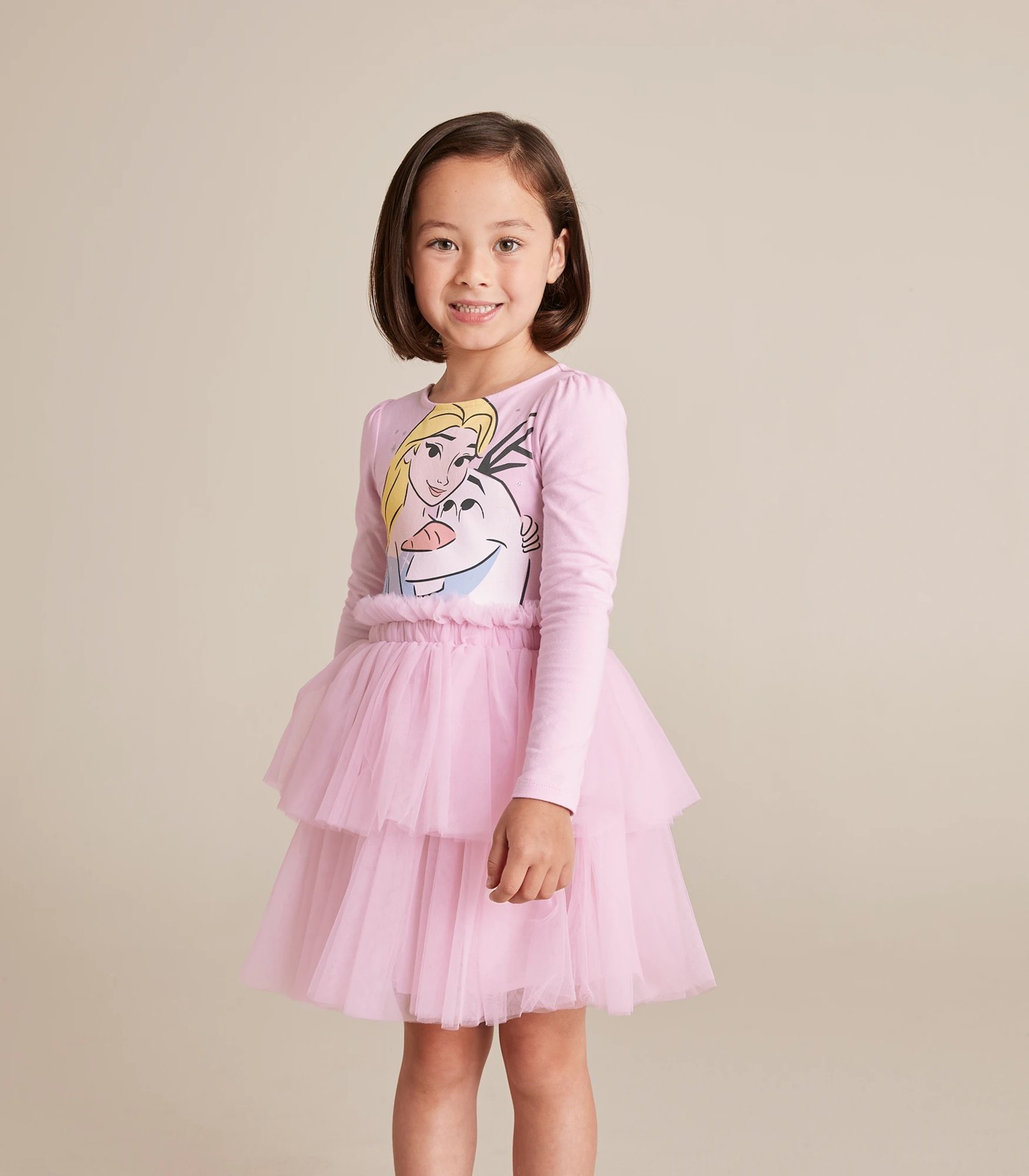 Fans will love the pink Disney Frozen Tulle Dress, featuring long sleeves with gathered shoulders, a large Elsa and Olaf print to chest with glitter accents and a tiered layered tulle skirt with cotton lining.