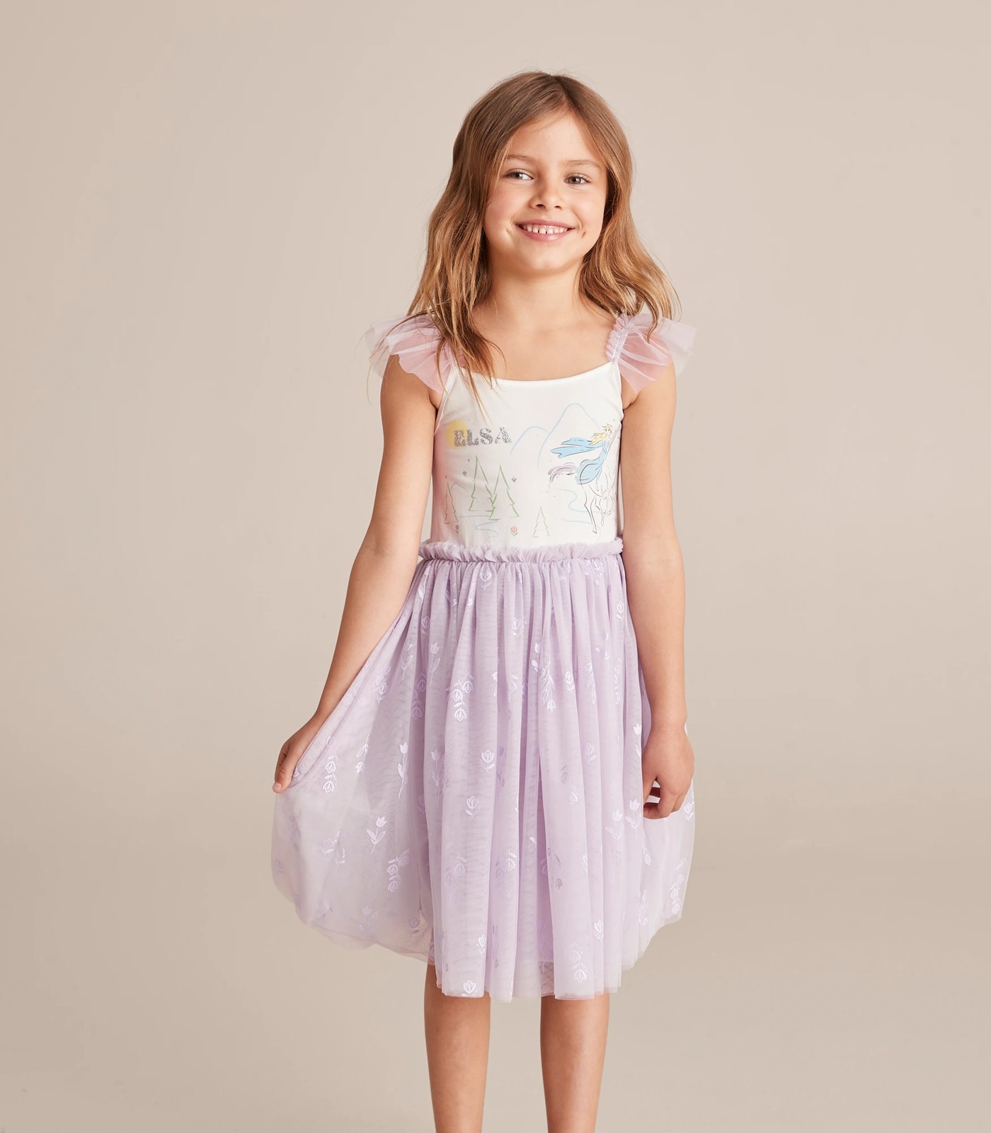 With a bodice that's crafted from soft and stretchy cotton, a large Elsa print to chest and tutu detailing spaghetti straps comes the purple Disney Frozen Tutu Dress.