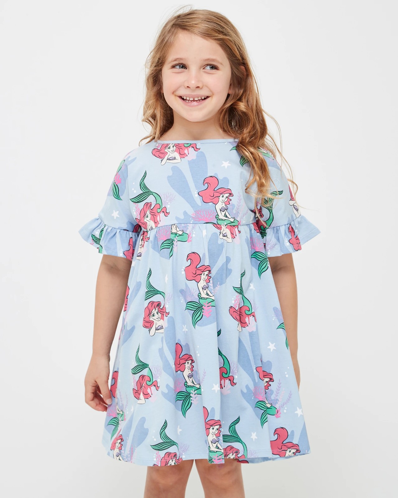 Bring a splash of Disney magic to her wardrobe with this Little Mermaid Ariel Babydoll Dress! Crafted from a cotton-rich fabric, this adorable dress features a classic regular fit and a blue all-over Ariel print. The dress is designed with a crew neck, short sleeves with frill trim, and an elastic waistband that's been gathered to create the perfect babydoll fit. She'll be ready for any occasion in this fun and fashionable dress!