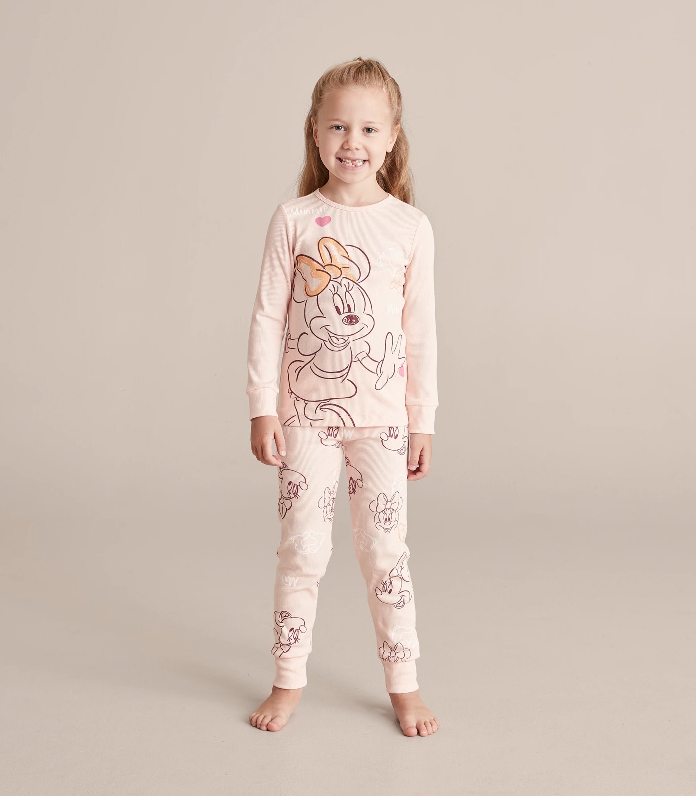 Fans will sleep blissfully in the great value 2 piece Disney Minnie Mouse Cotton Rib Pyjama Set, featuring a ribbed long sleeve top with Minnie Mouse print and matching pink pants, crafted from soft cotton for all day comfort.