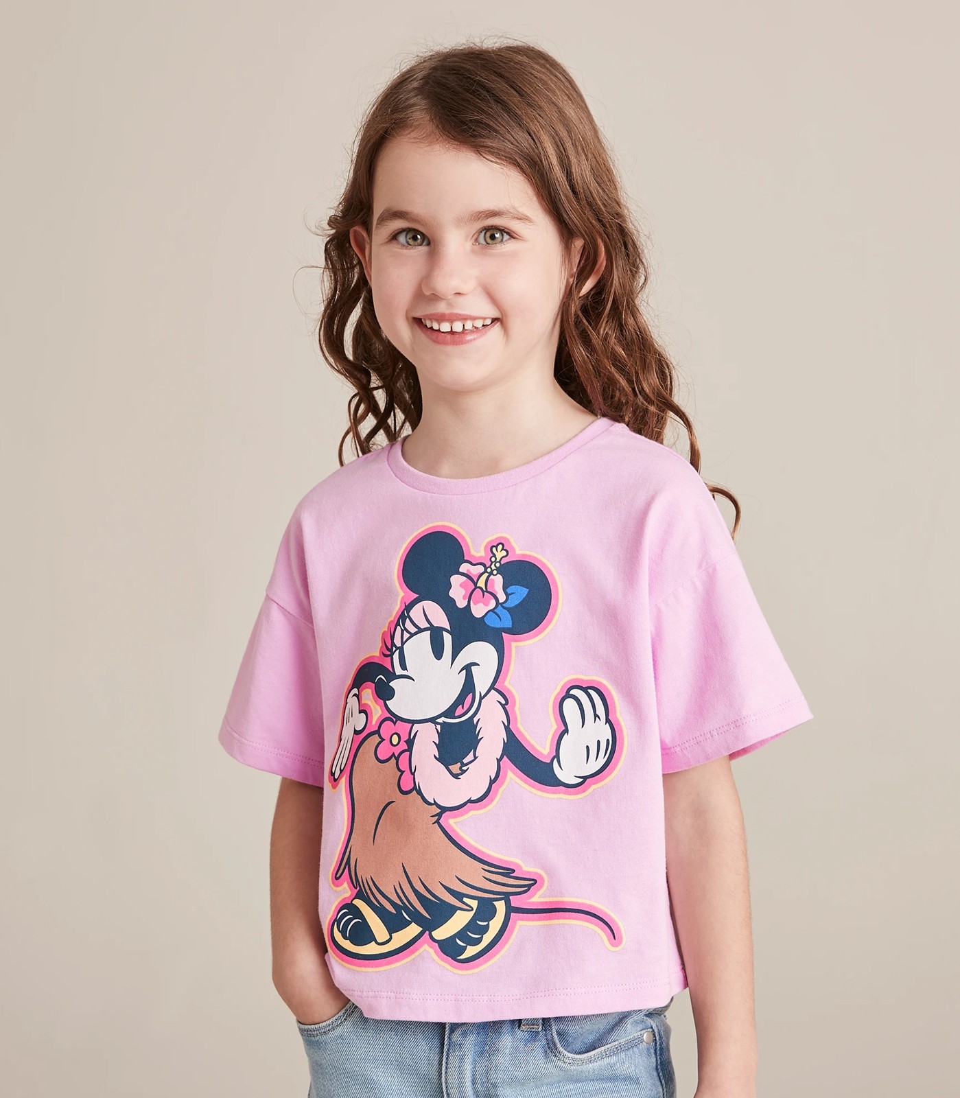 Show off some Disney style with this super cute Hula Minnie Mouse T-shirt from Target. Crafted from a cotton-rich fabric, this regular fit style features a classic crew neckline, short sleeves and a straight hem. The front is adorned with a large Minnie Mouse Hula print to the chest, making it perfect for any little girl's wardrobe.