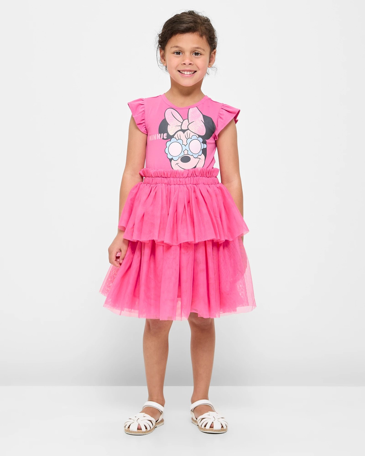 Let your little one shine with the Disney Minnie Mouse Tulle Dress, perfect for any Disney enthusiast. Made in a delightful pink hue, this dress features a charming glitter print of Minnie Mouse front and centre. Its tiered tulle skirt and gathered elastic waistband promise a fit that's comfortable yet enchanting. The sleeveless design, complete with frill trim, offers a playful touch that's ready for any adventure. Make every day a magical occasion by adding this precious piece to their wardrobe. Don't miss out, order today and let the Disney magic begin!