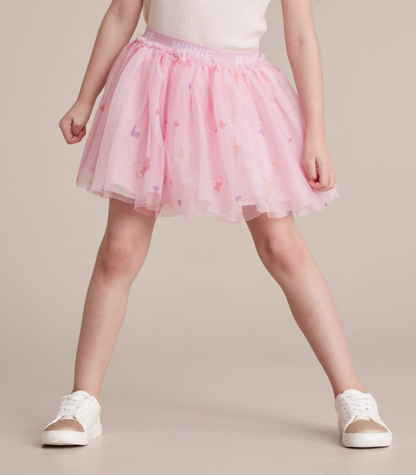 Top layer of tulle features Minnie Mouse print