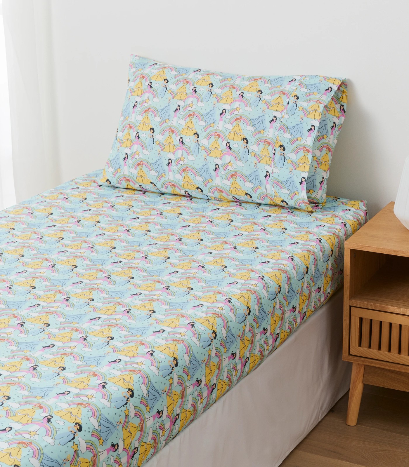 Welcome your little princess to dreamland with our enchanting Disney Princess Sheet Set. Crafted from soft, breathable and durable cotton with a 250 thread count, this beautiful sheet set is sure to be a favorite. The mint green color and all-over Disney Princess character print will have your little one feeling like royalty in no time! Plus, it's conveniently machine washable for easy care. Complete the look with the matching Disney Princess Quilt Cover Set; sold separately.
