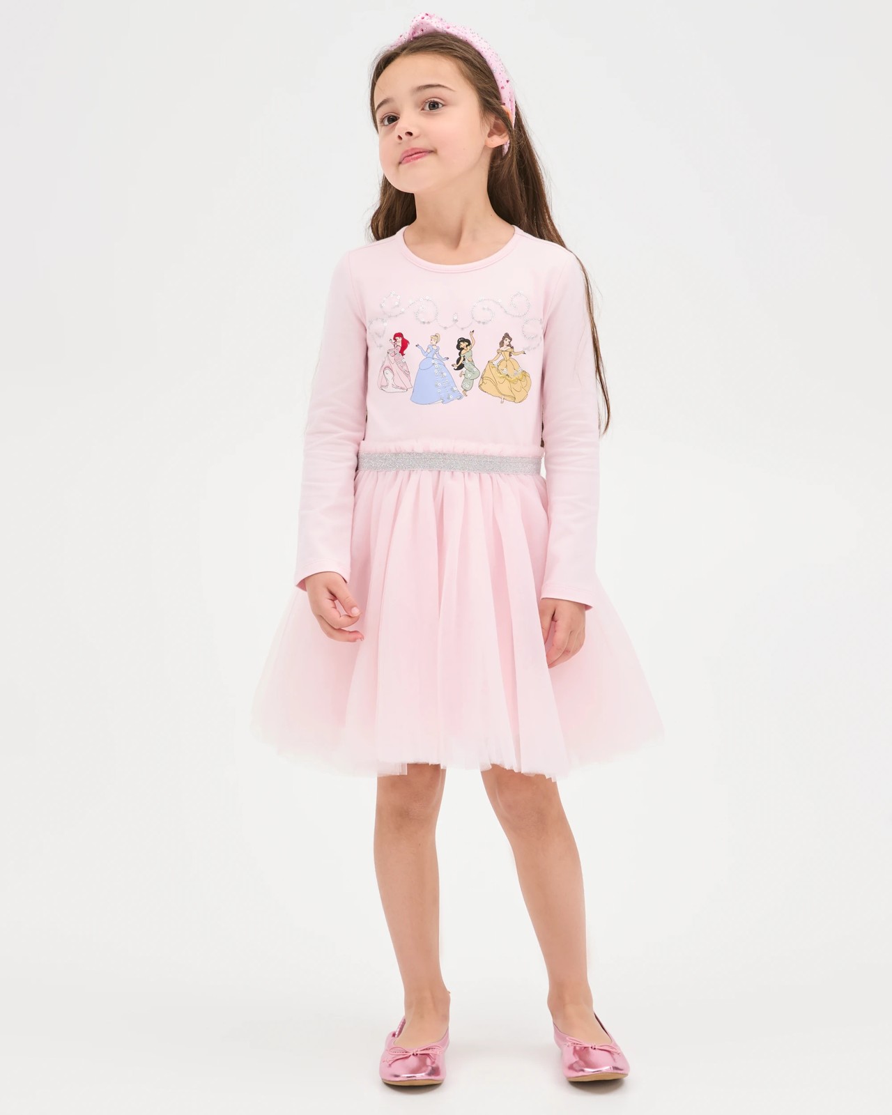 Let your child's imagination come alive with the Disney Princess Tulle Dress. Featuring a vibrant Disney Princess print and delightful applique details, this dress brings a sprinkle of wonder to any occasion. The soft knit design and long sleeves ensure lasting comfort during both playdates and parties. The gentle A-line shape complemented by a whimsical tulle overlay on the skirt adds a magical flair, perfect for joyful twirls and laughter. Watch your little one light up with every spin and embark on their own royal adventure. Add this enchanting dress to her collection and turn everyday moments into magical memories.