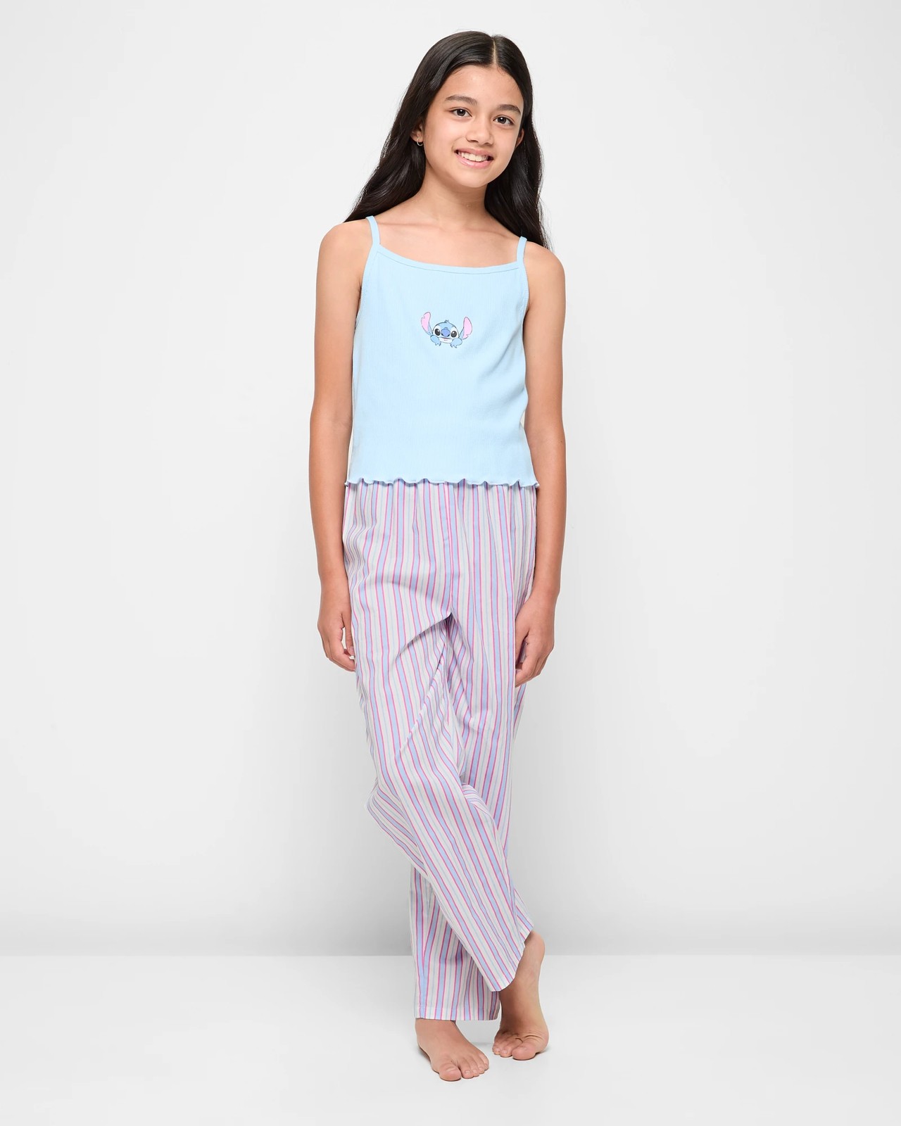 Introduce a touch of Disney magic to your bedtime routine with this adorable Stitch cami and pyjama set. Designed in a serene blue hue, this regular fit sleep set is perfect for girls who love comfort and style. The cami top, made from soft cotton with a hint of stretch, features a charming Stitch placement print, a ribbed texture, and a square neck with rib trim. The sleeveless design and lettuce edge hem add a cute touch. Paired with matching trousers that showcase a delightful all-over print on white, blue, and pink stripes, these comfortable woven cotton pyjamas have an elastic waistband for easy wear. Snuggle up in cosy comfort and let your dreams take you to the magical world of Disney. A must-have for any young Disney fan.