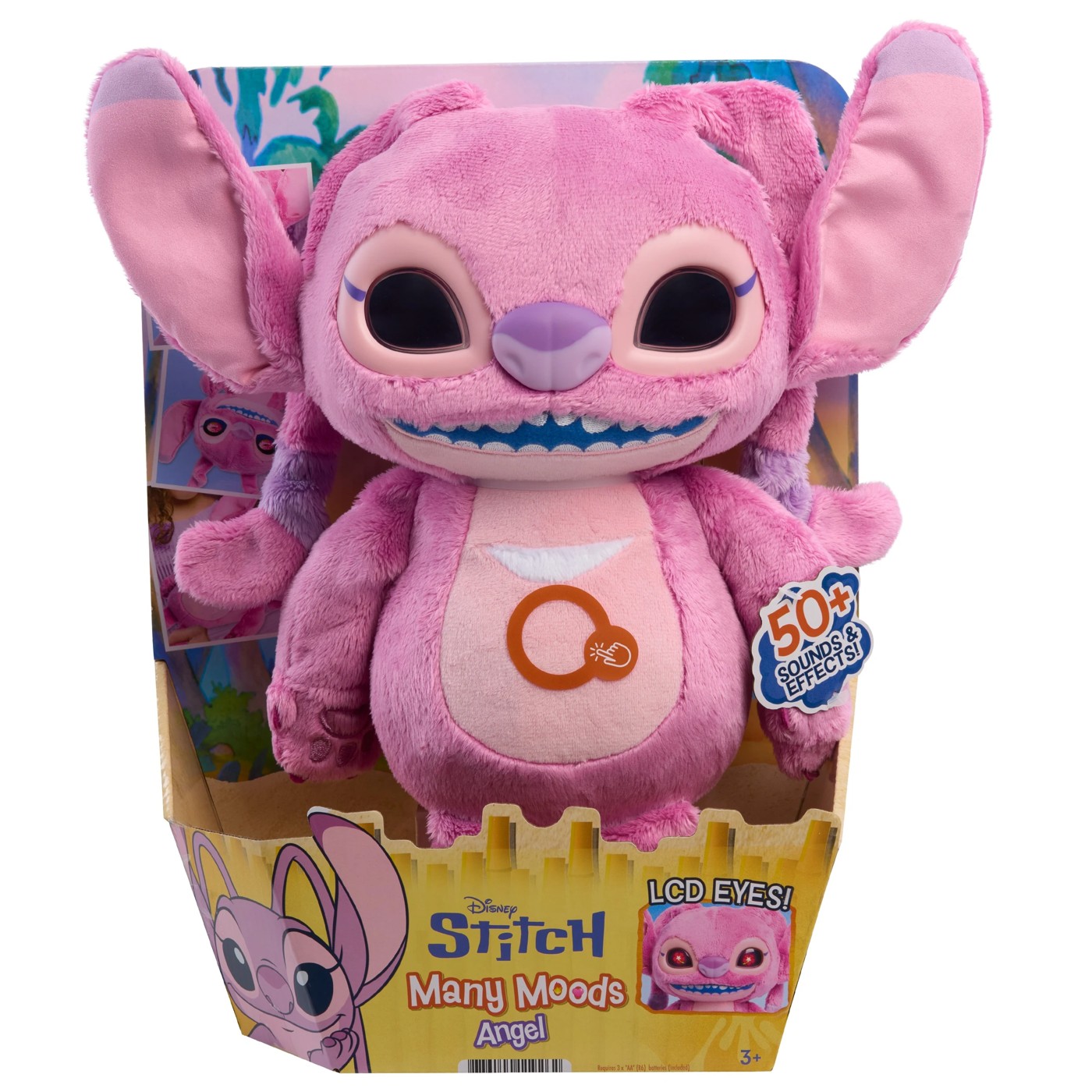So many moods. All so Angel. Meet Disney’s Stitch Many Moods Angel feature plush toy — the plush that’s equal parts sweet, sassy, and totally unpredictable. Inspired by Disney’s Stitch, this 13.5-inch interactive plush brings Angel’s big personality to shelves with animated LCD eyes and over 50 sounds and reactions. Slide the switch on its back from TRY ME to ON to unlock Angel’s full range of emotions. Pet her forehead to reveal her lovable side, rub her belly for playful antics, or “feed” her when she’s hungry. Jiggle, tilt, or hold this Angel plushie upside down to activate silly phrases, sound effects, and animated eye reactions — but too much bouncing might make her grumpy! When it’s time to wind down, gently rock Angel to hear adorable yawns as her eyes close for sleep. An exciting addition to a Disney collection or any lineup of stuffed animals, the Many Moods Angel plush toy offers endless entertainment with animated LCD visual effects and multiple play modes for cuddly fun. Requires 3 x AAA batteries (included). For kids ages 3 years and up.