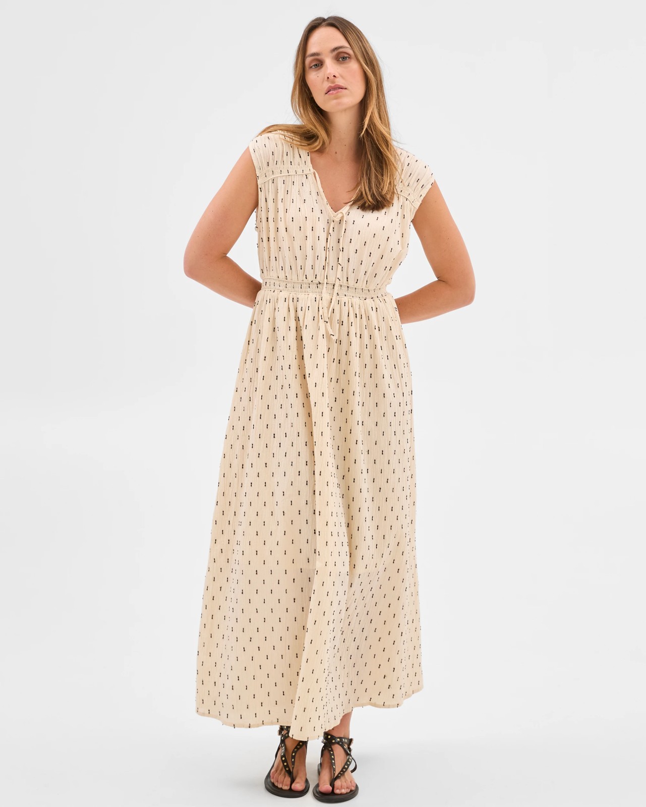 Step into easy sophistication with the Dobby Maxi Dress and enjoy the gentle touch of soft cotton-linen against your skin. Its V-neckline with a charming tie adds a modern twist, while delicate pleating through the shoulders and bodice creates interest and movement. The long sleeves with comfortable elastic cuffs offer a relaxed and versatile look for any occasion. The dress is enhanced with a diamond detail at the waist and a gathered skirt, making it perfect for both casual and dressy moments. The maxi length and thick panel hem provide an elegant finish as you walk. Whether you are heading to brunch or meeting friends for a stroll, this maxi dress combines comfort and timeless appeal in one beautiful piece. Treat yourself to a dress you will reach for time and again and step out with renewed confidence today.