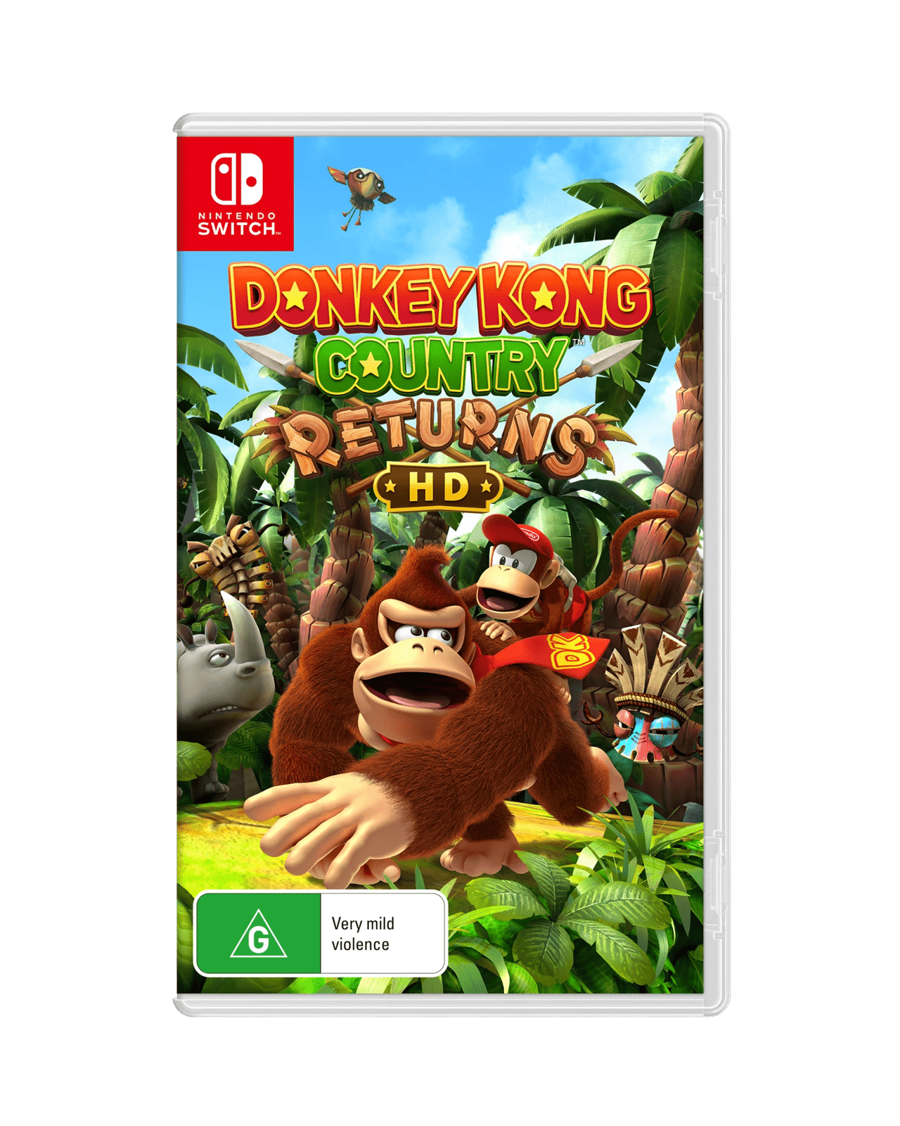 Help Donkey Kong and Diddy Kong recover their precious banana hoard from the villainous Tiki Tak Tribe in Donkey Kong Country Returns HD for Nintendo Switch! Stomp enemies, blast through barrels, and ride rockets and mine carts (and even Rambi the rhino) in 80 levels across nine worlds.