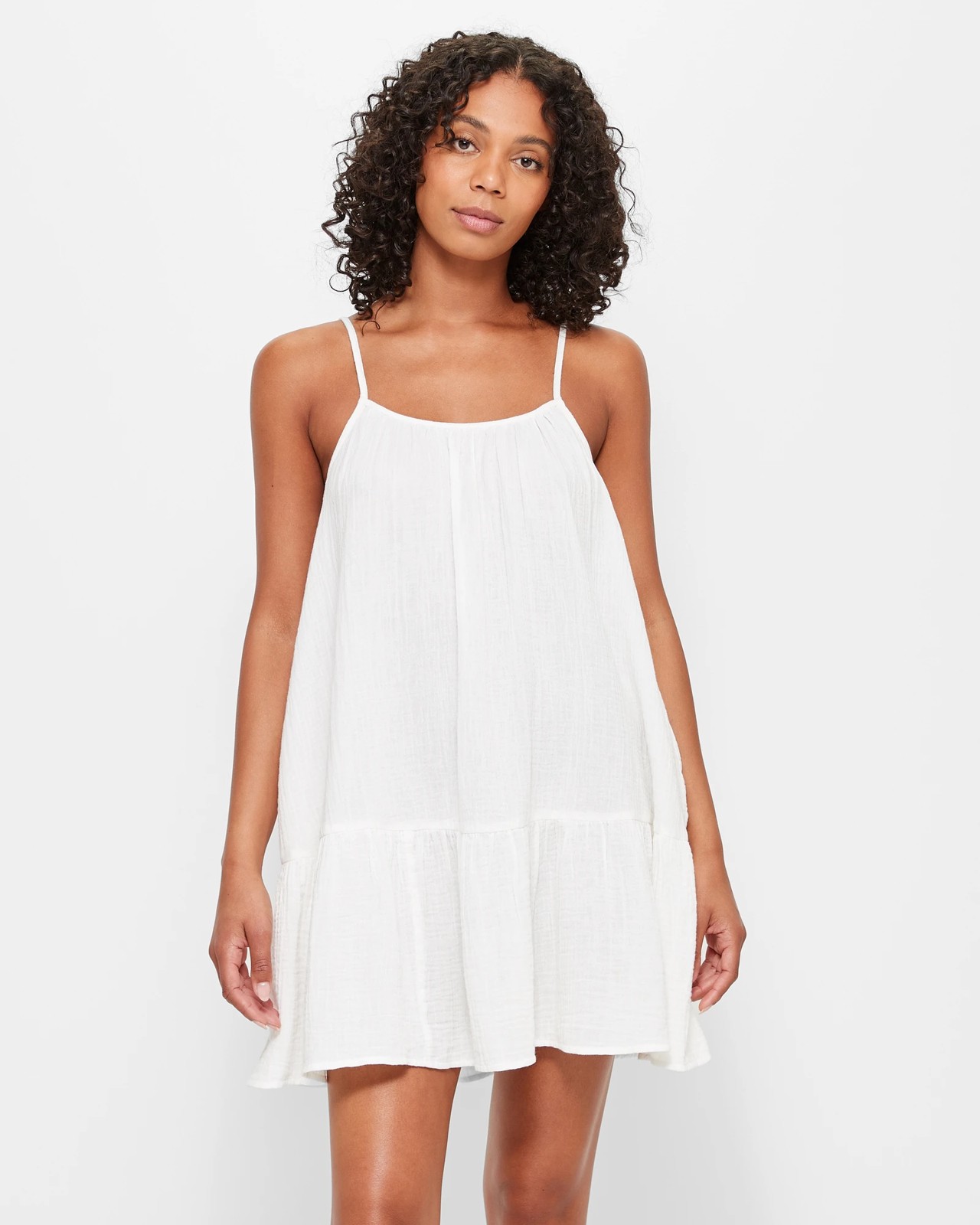 Indulge in the sheer brilliance of our Double Cloth Mini Dress. This delightful dress is crafted from a premium cotton fabrication, ensuring utmost comfort and sustainability. Designed for a regular fit, it features a stunning white colour with an all-over crinkle material that adds a touch of charm. The dress is styled with a scoop neckline and thin adjustable shoulder straps for a flattering look. With side seam pockets and a tiered bottom panel, this mini length dress is both stylish and practical. Complete your summer wardrobe with this versatile piece, perfect for day-to-night occasions. Embrace effortless elegance and make a statement today!