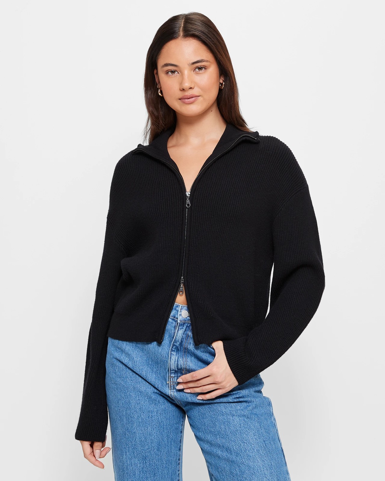 Wrap up in style with the Lily Loves Double Zip Front Cardigan. Crafted from a luxurious viscose, polyester, and nylon blend, this cardigan features an eye-catching ribbed knit design and a practical double zip fastening for added versatility. The regular fit and round high neckline offer comfort and a timeless appeal. Complete with long sleeves and a straight cuffed hemline, this cardigan is perfect for layering over your favourite outfit. Embrace warmth and style with this must-have addition to your wardrobe!