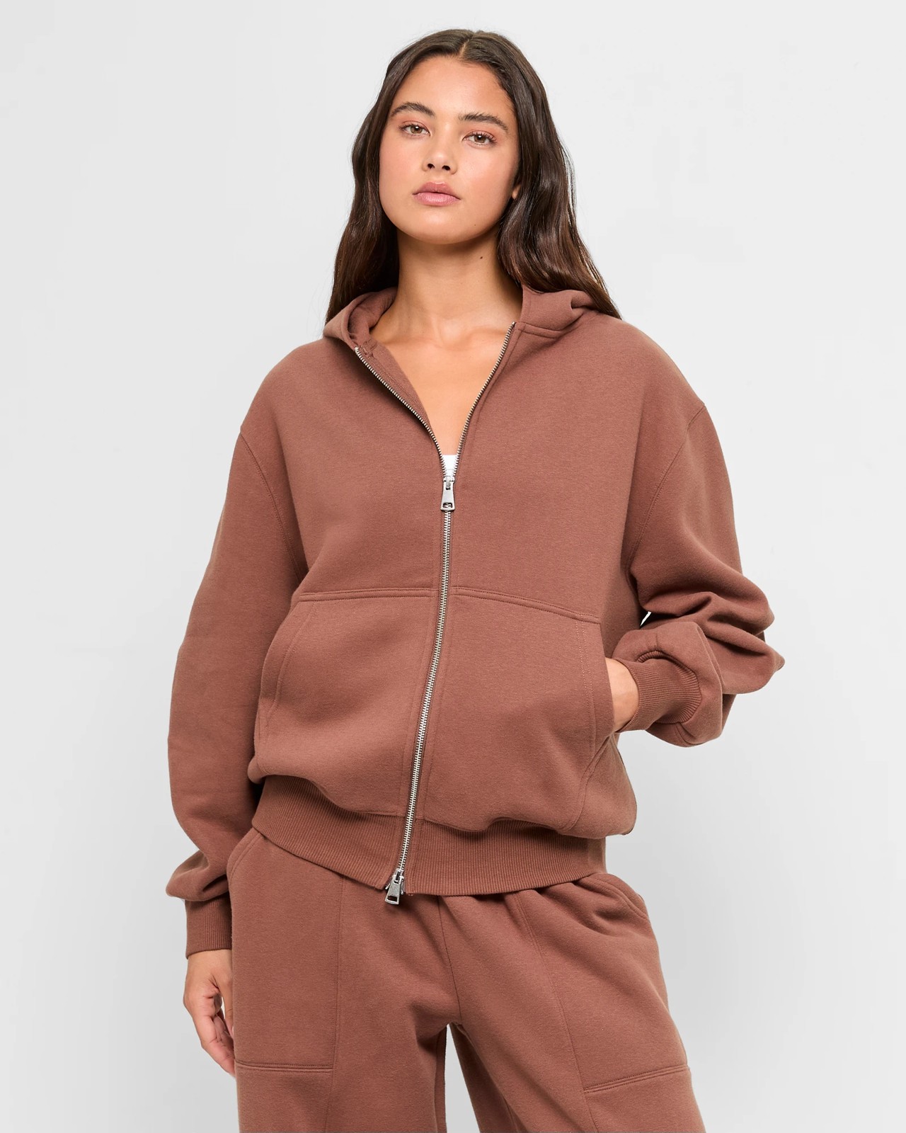 Experience unparalleled comfort with the Double Zip Hoodie by Lily Loves. Made from a high-quality cotton and polyester blend, this cocoa brown hoodie features a cosy inner fleece lining that keeps you warm during those chilly days. The regular fit design ensures a relaxed wear, while the round hooded neckline and double zip front lend stylish versatility. Long ribbed cuff sleeves and a front kangaroo pocket add to its functional appeal. Perfect for casual outings, this hoodie's thick ribbed straight hemline provides a snug fit. Get yours today and make this an essential part of your wardrobe.