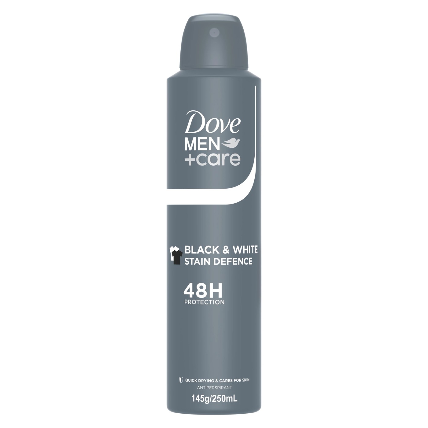 Get the protection and care you need without the deodorant stains you don’t with Dove Men+Care Stain Defence Antiperspirant Aerosol. This spray deodorant provides 48 hours of protection against sweat, odour and marks on your clothes, keeping them stain free for longer. Containing ¼ moisturising cream, this alcohol-free* formula cares for your underarms and shields them from irritation. Your skin is left feeling comfortable with a long-lasting fragrance that keeps you smelling fresh all day long. This antiperspirant deodorant spray is tough on sweat, not on skin and suitable for everyday use. Dove Men+Care does not test on animals anywhere in the world and our Stain Defence Antiperspirant Aerosol is PETA-Approved Vegan.Dove Men+Care celebrates a new definition of strength: one with care at its centre. Real strength is shown through the care you give to the people that matter - and that includes you.To ensure complete antiperspirant protection, give the can a good shake, then hold it 15cm away from your underarm and spray evenly in short bursts in a well-ventilated area. Our deodorant spray is made in Australia with renewable grid electricity and comes in a recyclable metal can - please recycle when empty. Whether you’re looking for a deodorant for men to keep you feeling fresh and dry all day or a body wash to help keep your skin hydrated, Dove Men+Care products are designed to protect and care for your skin.