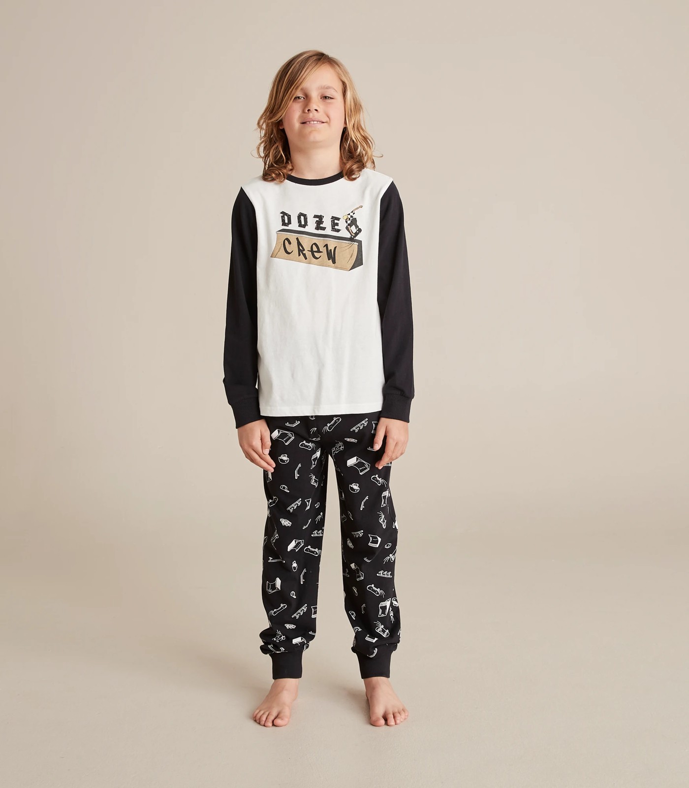 He'll sleep blissfully in the great value 2 piece Doze Crew Cotton Pyjama Set, with a long sleeve top and matching skate print pants, both made from soft cotton for all night comfort.