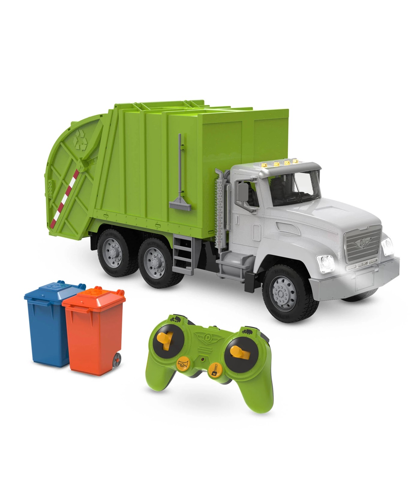 Strong and sturdy, this four-wheel drive toy truck makes collecting recycling a breeze. Press the ignition button on the remote to activate all of this toy vehicle’s functions—it’ll also make a realistic sound! Then, use the remote to move the toy truck forwards, backwards, and side to side to navigate the city’s traffic. It even makes a horn noise—beep beep! Load the 2 toy recycling bins onto the back of the truck, then empty them into the container. Now it’s time to head to the imaginary recycling center—you can flash the toy truck’s headlights if it’s dark out! Finally, use the remote to raise and lower the container to empty it out. Remember: Stay DRIVEN, because the crew depends on you!
