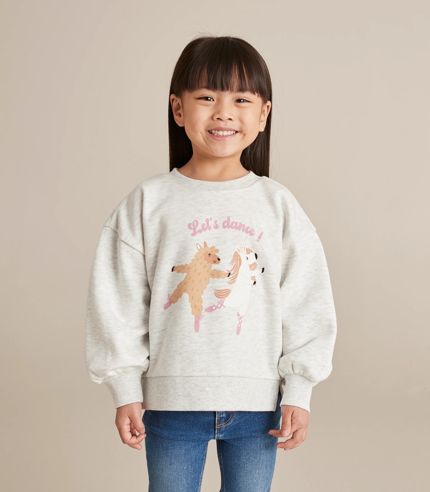 Crafted from soft poly blend with a fun dancing llama and unicorn print to front comes the grey marle Drop Shoulder Jumper.