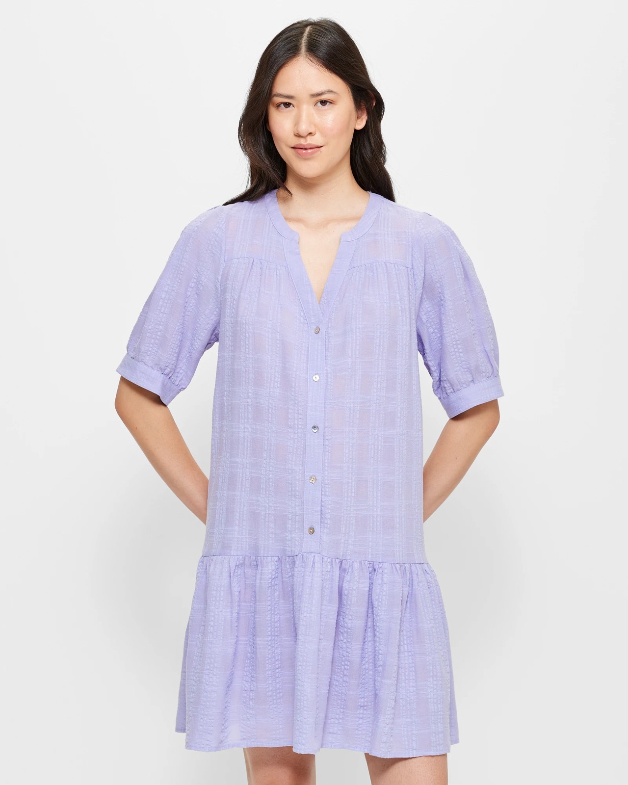 This Drop Waist Mini Dress is an essential addition to any woman's wardrobe. Made from a high-quality cotton/viscose blend, this dress offers both comfort and style. The all-over textured material adds a unique touch to the dress, while the regular fit flatters the figure. Featuring a vibrant colour, this dress is perfect for any occasion. The round neckline with a v-drop front adds a subtle feminine touch, while the mid-length sleeves with cuffs add a touch of sophistication. The chest yoke panel and button-down front enhance the silhouette, creating a flattering fit. The large bottom panel gives the dress a flowy and relaxed look. The straight hemline and mini length make it ideal for both casual outings and formal events. With this Drop Waist Mini Dress, you'll feel confident and stylish wherever you go. Don't miss out on this versatile and fashionable piece. Add it to your cart now!