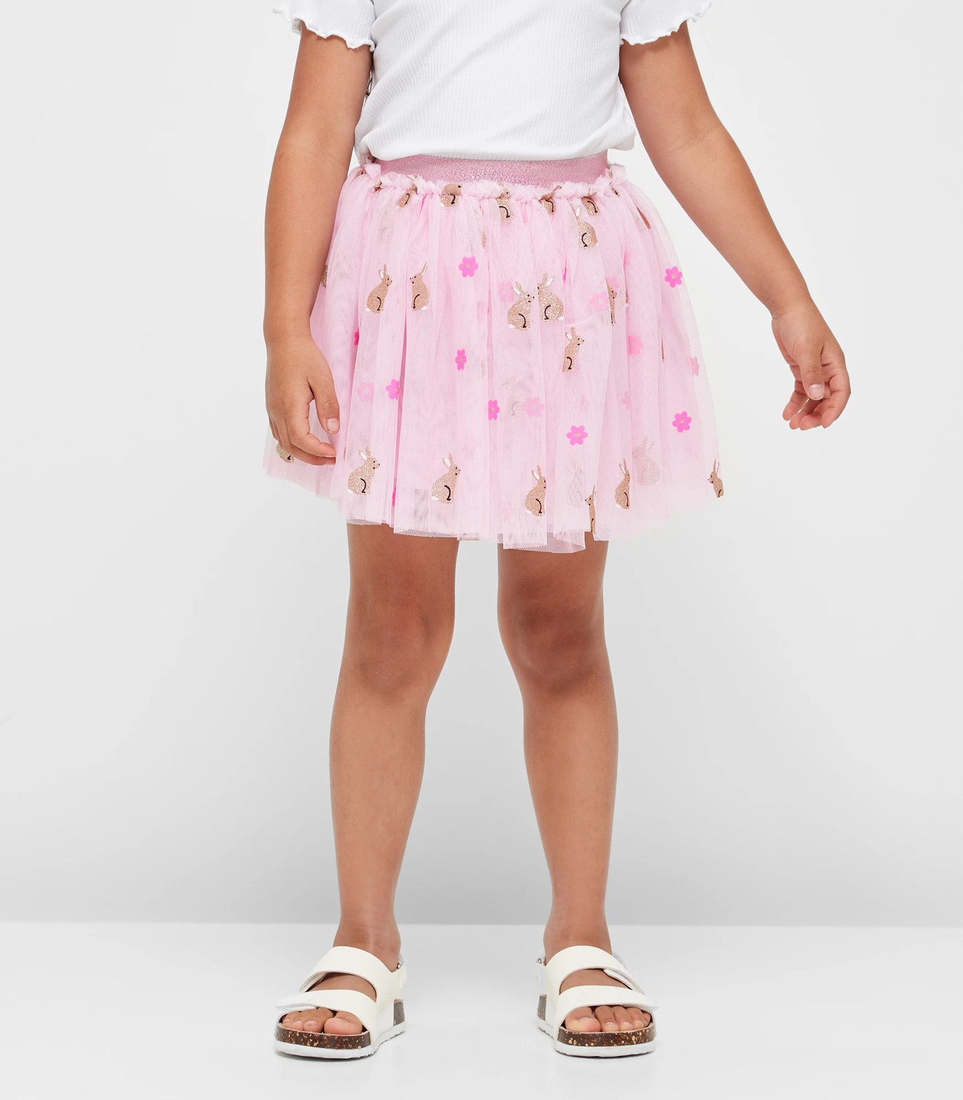 Let your little one dazzle in our beautiful Easter Bunny Glitter Tulle Skirt. With its delightful pink hue and shimmering glitter waistband, this skirt is perfect for Easter egg hunts or springtime gatherings. The layered tulle is beautifully adorned with glittery Easter bunny accents for a whimsical touch. Its regular slip-on fit ensures comfort all day long.