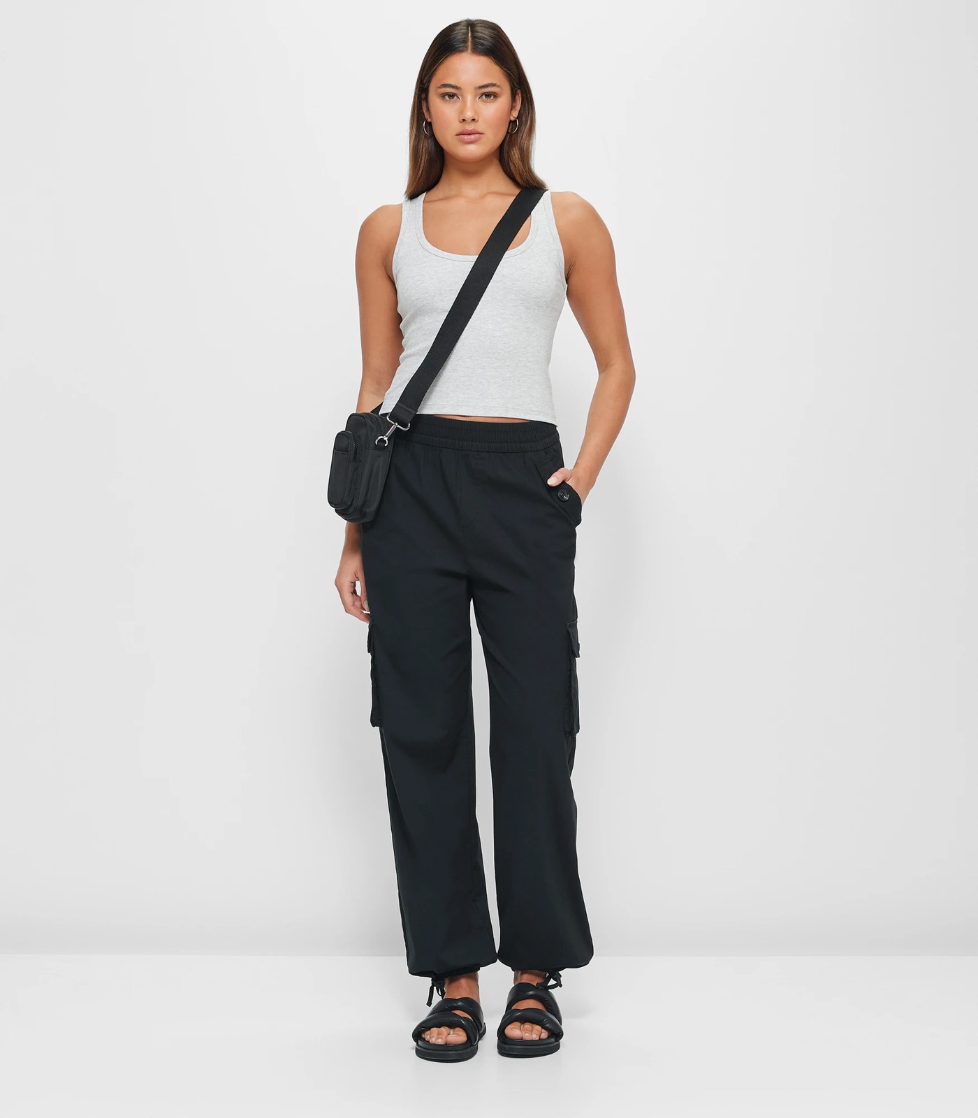 Introducing the Elastic Waist Cargo Pants by Lily Loves. These versatile pants are made from a high-quality cotton/nylon blend, providing ultimate comfort and stretch. The regular fit and thick elastic waistband ensure a snug and comfortable fit. With features like a mock front fly, side pockets with fold over button closure flap, and side fold over top button closure cargo pockets, these pants are not only practical but also stylish. The straight cut leg and ancle length add a trendy touch, while the side pull tie drawstring hemline offers adjustable options. Complete with open back pockets for extra storage. Upgrade your wardrobe with these must-have cargo pants today!