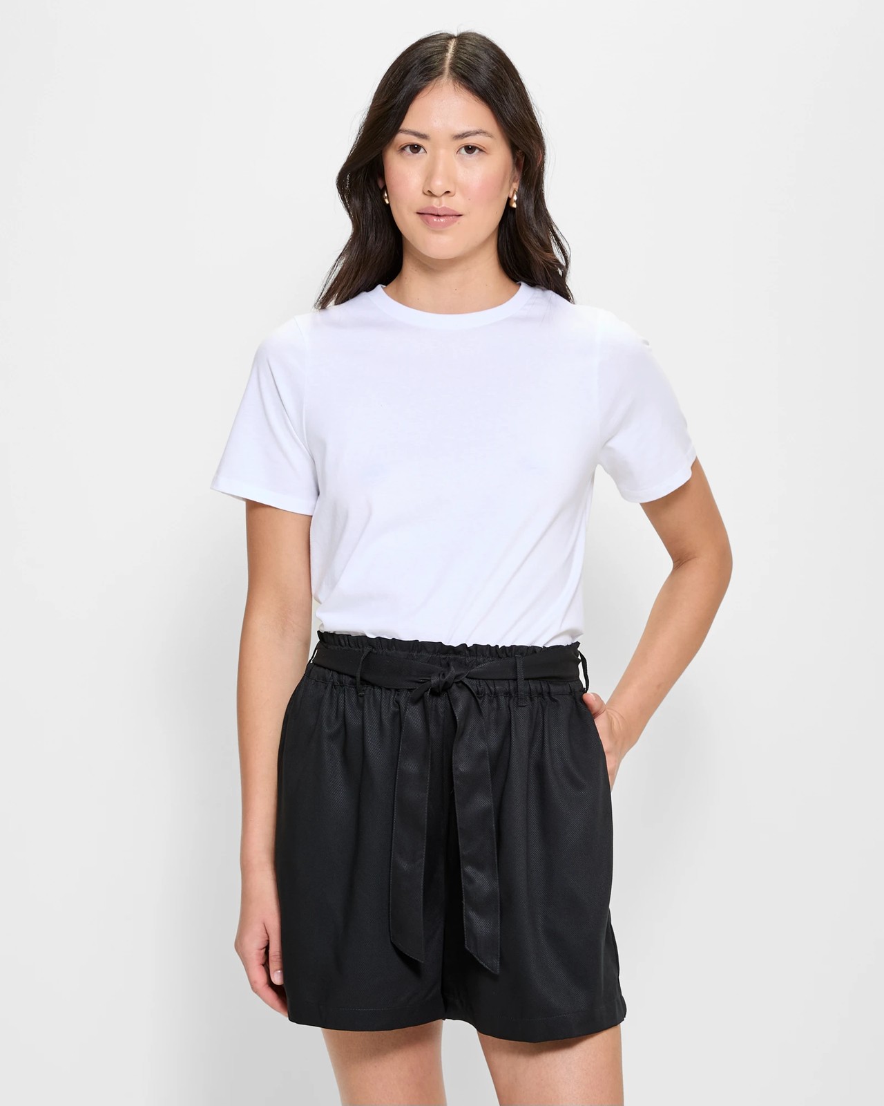 Enjoy ultimate comfort with these women's elastic waist shorts, designed from soft and breathable viscose. These shorts offer a regular fit and an easy pull-on design featuring a thick elastic waistband with belt loops for added security. The removable tie waist belt allows for a personalised fit, while the side seam pockets provide practical storage. Their short length and straight hemline make them ideal for casual outings or relaxing at home. Upgrade your wardrobe with these stylish and hassle-free shorts.