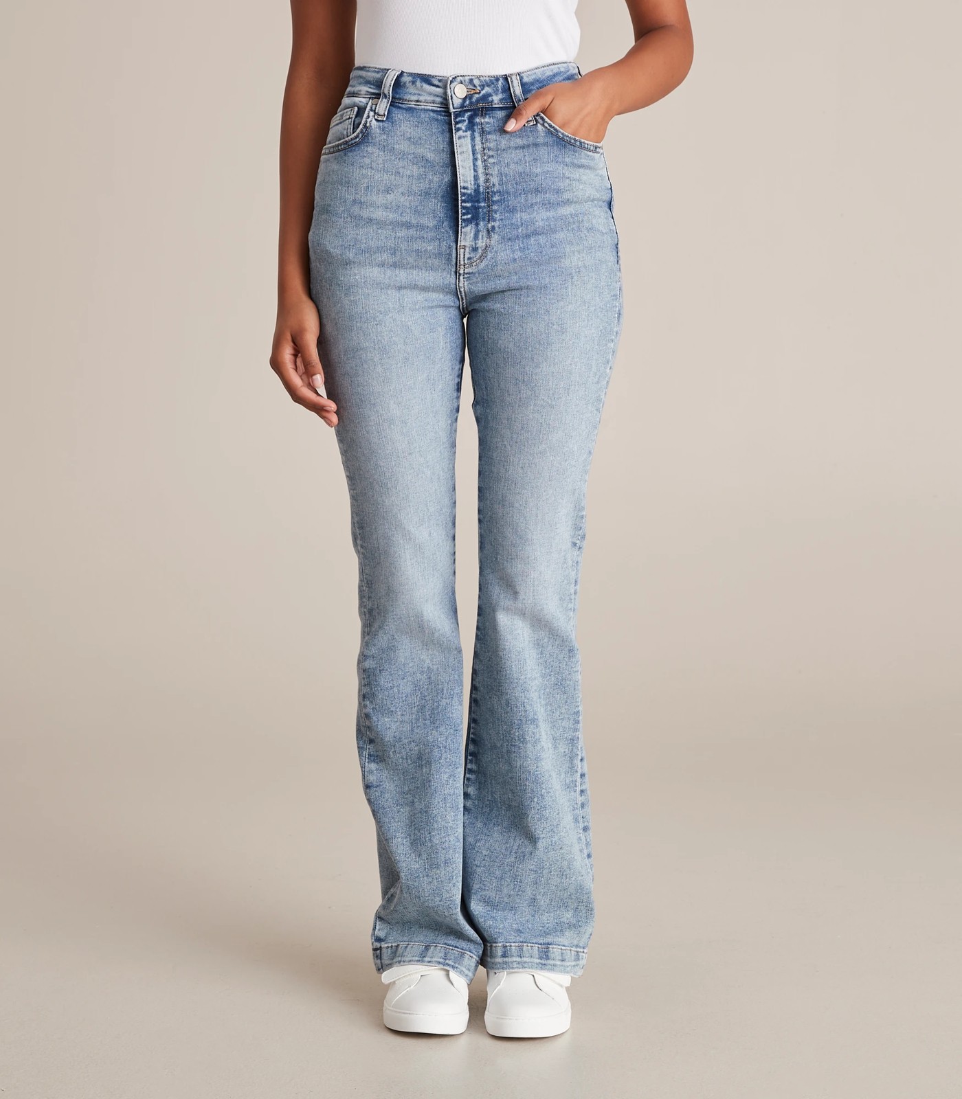Comfort meets vintage with these super high waisted Eliza flare denim jeans! Dress them up or down with simple tweaks to your outfit for any occasion, they feature a super high waist, a wide leg flared design and are made from an breathable cotton rich fabrication.