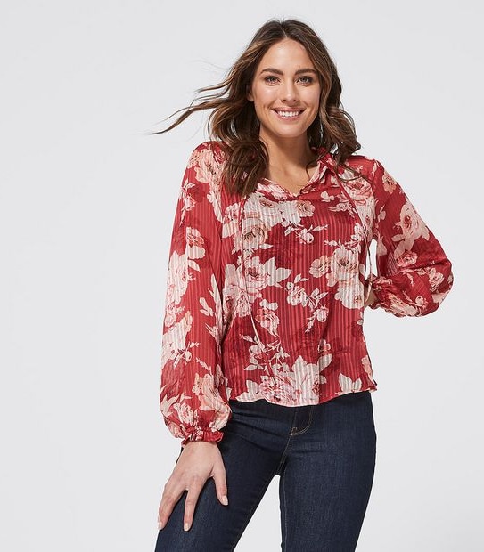 The red floral ellie peasant blouse provides a feminine touch to your outfit. Perfectly matched with denim or tailored bottoms.