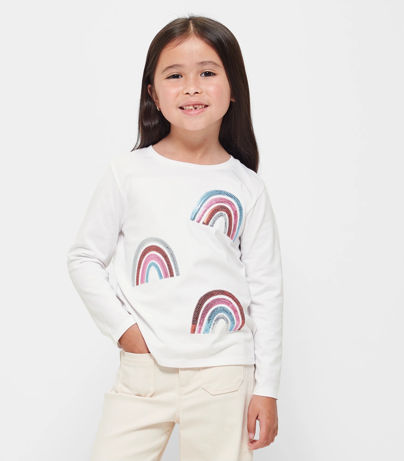 Wrap your little one in charming glamour with our Embellished Sequin Print Top. This delightful top features a gorgeous sequin print on the front, adding a touch of sparkle to any outfit. With a classic crew neck and long sleeves, this cotton top offers a comfortable and stylish fit for everyday wear. Perfect for adding a touch of magic to any casual look, this top is sure to become a favourite in your child's wardrobe.