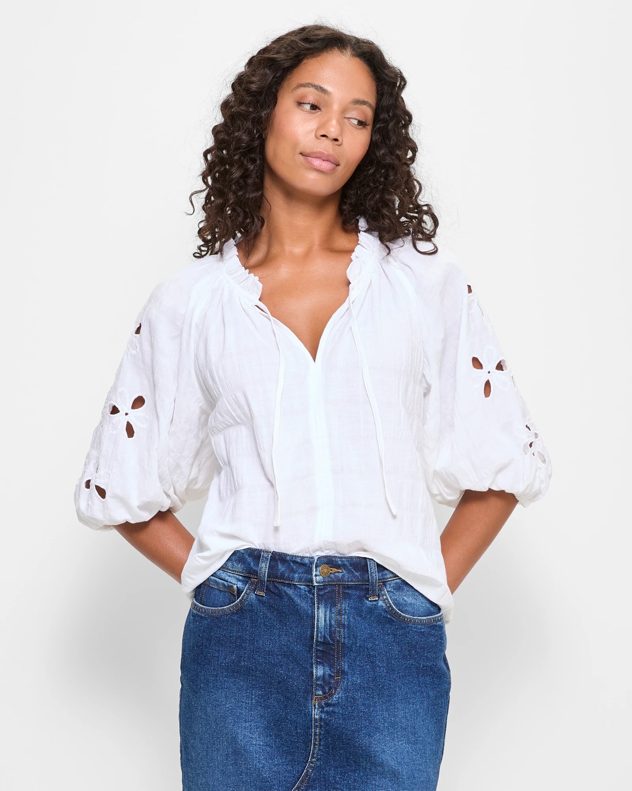Discover effortless style with our Embroidered 3/4 Sleeve Blouse, an essential addition to any wardrobe. Made from soft cotton, this blouse ensures light and airy wear throughout the day, making it perfect for any occasion. The all-over textured design adds a touch of sophistication, while the intricate embroidered cut-outs on the arms bring a unique flair. The round neckline with an upper frill and centre tie front, combined with a v-drop, offers a charming fit. Embrace the charm and comfort of this regular fit blouse, featuring 3/4 puff sleeves and a straight hemline. Ideal for pairing with your favourite trousers or skirts, this blouse is a versatile piece for any stylish woman. Get yours now to refresh your everyday look.