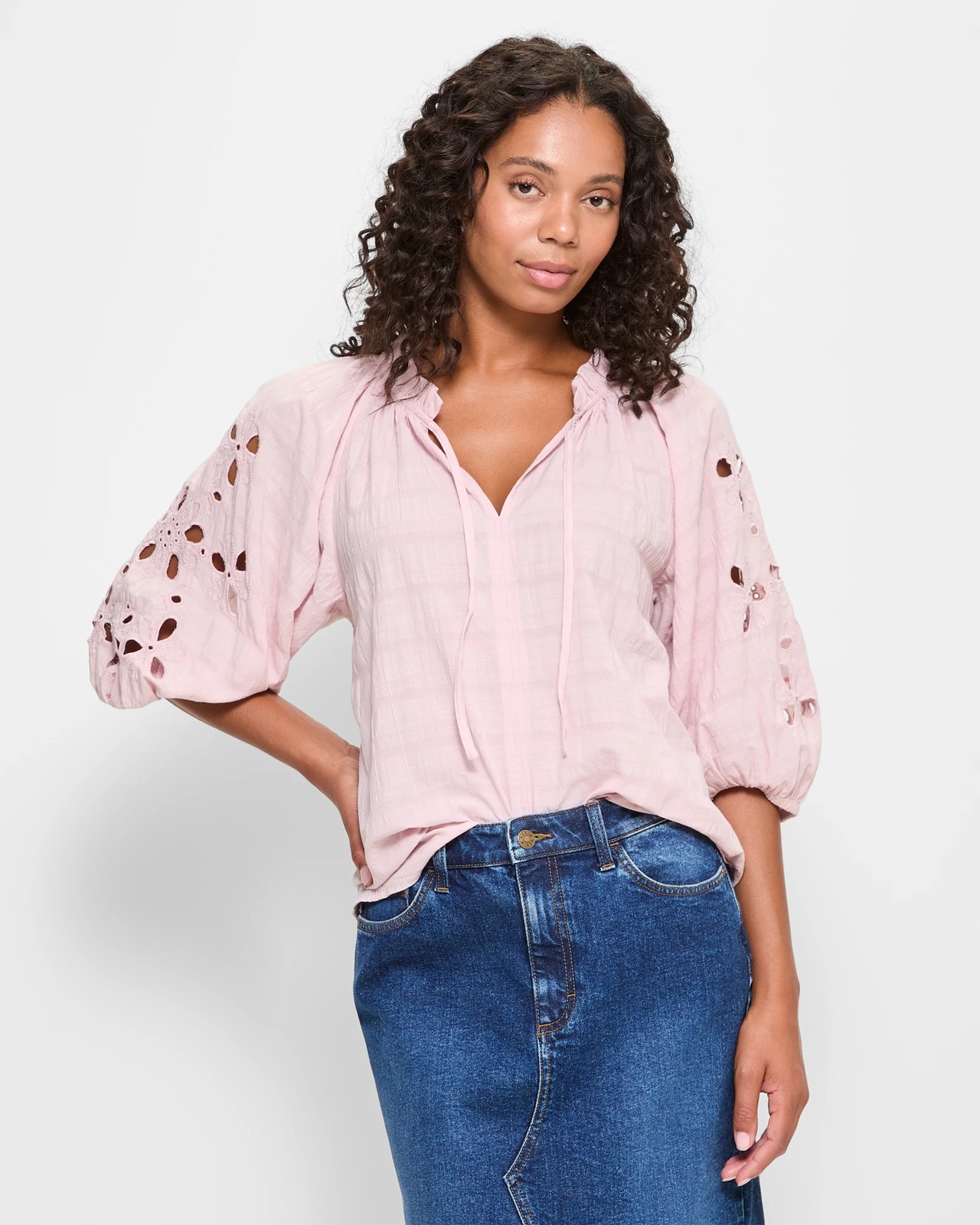 Discover effortless style with our Embroidered 3/4 Sleeve Blouse, an essential addition to any wardrobe. Made from soft cotton, this blouse ensures light and airy wear throughout the day, making it perfect for any occasion. The all-over textured design adds a touch of sophistication, while the intricate embroidered cut-outs on the arms bring a unique flair. The round neckline with an upper frill and centre tie front, combined with a v-drop, offers a charming fit. Embrace the charm and comfort of this regular fit blouse, featuring 3/4 puff sleeves and a straight hemline. Ideal for pairing with your favourite trousers or skirts, this blouse is a versatile piece for any stylish woman. Get yours now to refresh your everyday look.