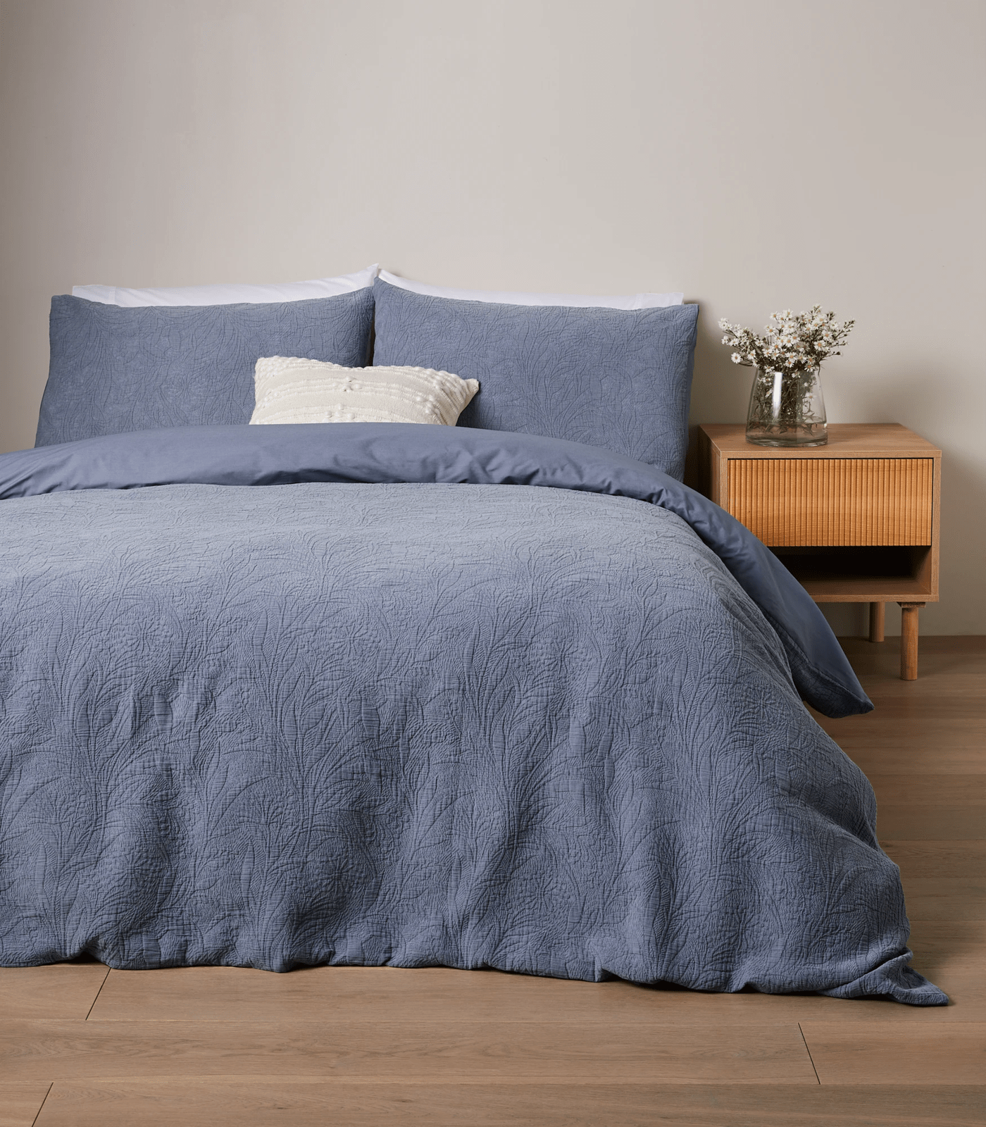 The navy blue Emira Foliage Matelasse Quilt Cover Set is made from soft, breathable cotton for comfort all year round. Each set includes a quilt cover and two matching pillowcases. Style with the matching Emira Foliage Matelasse European Pillowcase (sold separately) to complete the look.