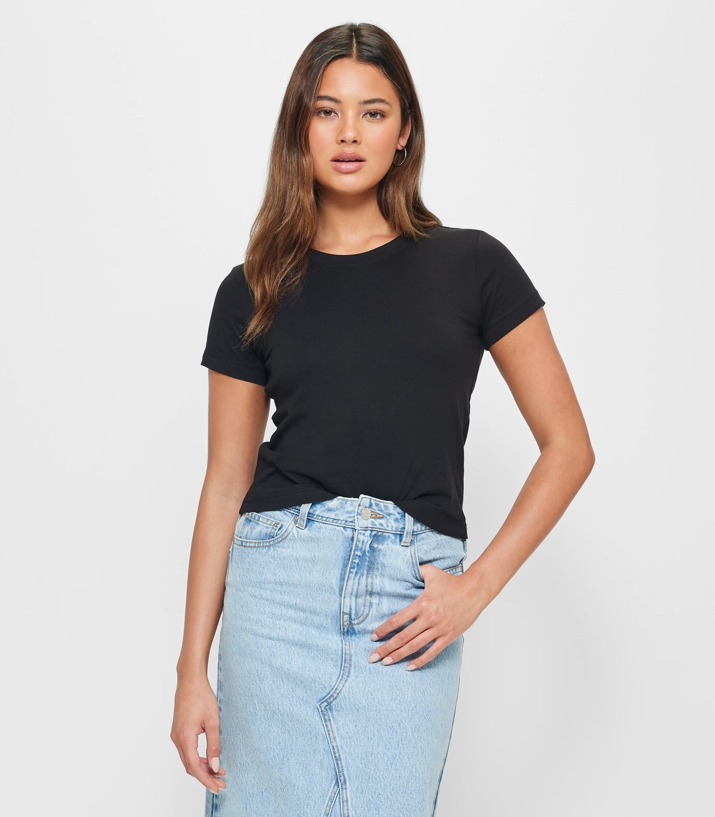 Introducing the must-have Essential T-Shirt by Lily Loves. Crafted from a premium cotton fabrication, this tee offers a comfortable regular fit. Its sleek black design is complemented by a ribbed crew neckline and short sleeves, making it a versatile addition to your wardrobe. The straight hemline and short length add a modern touch to this classic staple. Perfect for any occasion, this Essential T-Shirt is an essential piece for every fashion-conscious individual. Don't miss out on this timeless style. Add it to your cart now and elevate your everyday looks!